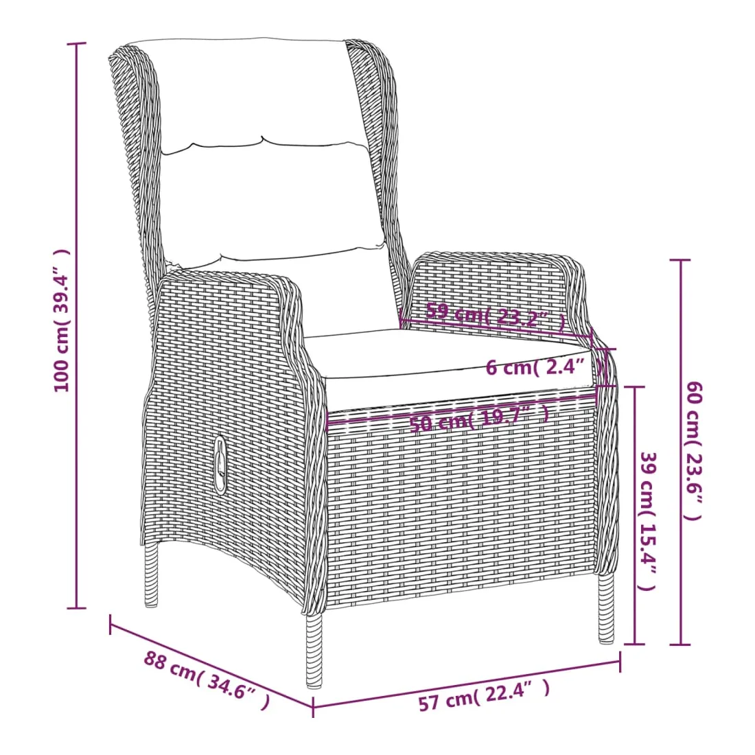 • Dimensions de la chaise (lorsqu'elle n'est pas inclinée) : 57 x 88 x 100 cm (I x P x H)