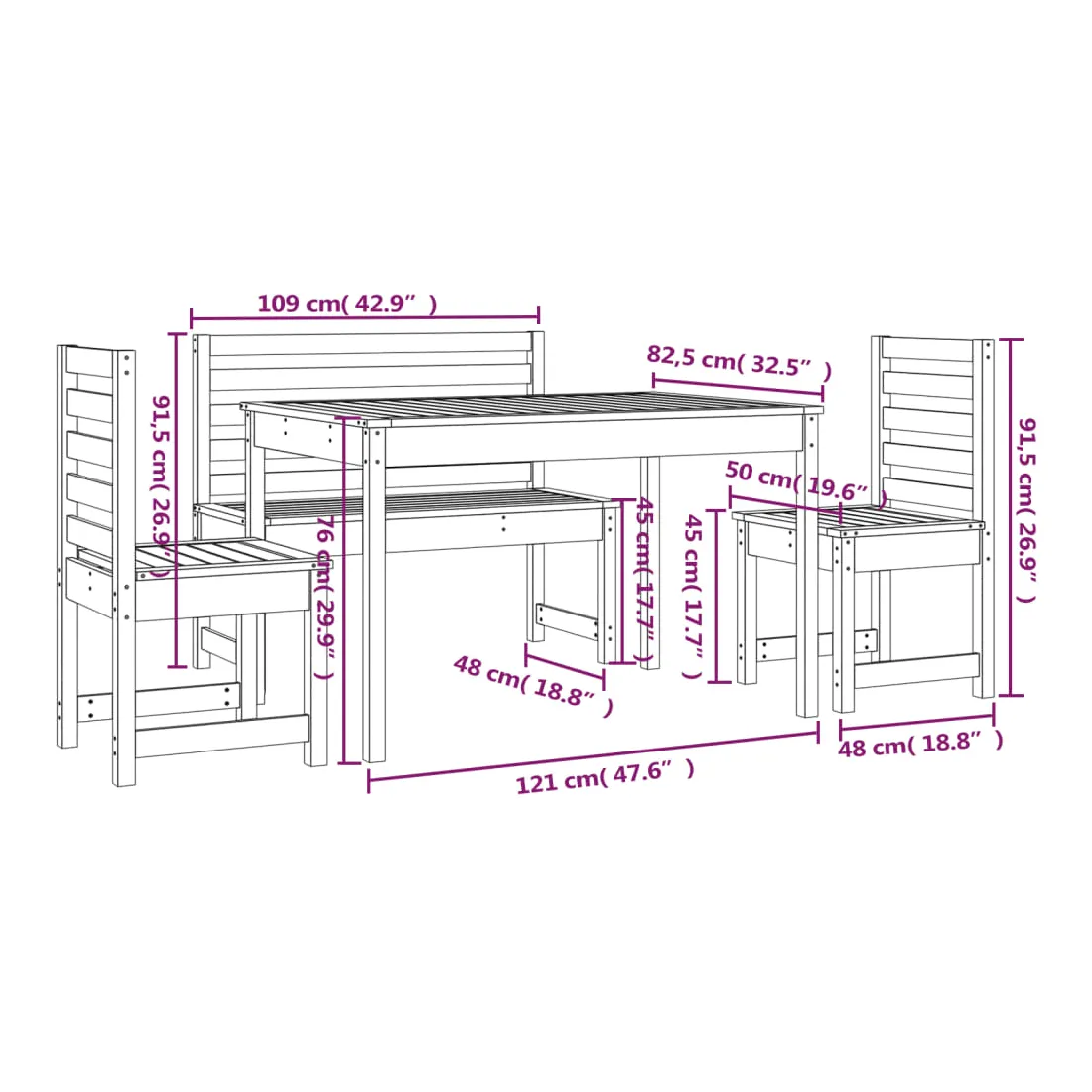 Cet ensemble à manger de jardin classique en bois est parfait pour une utilisation à l'extérieur et est conçu pour être le point central de votre jardin, terrasse ou patio, etc. Bois de pin massif : l'ensemble à manger est fabriqué en bois de pin massif. Le bois de pin massif est un matériau naturel magnifique. Le bois de pin a un grain droit et les nœuds donnent au matériau son aspect caractéristique et rustique.Dessus de table pratique : cette table à manger vous offre un dessus de table solide. Vous pouvez placer vos collations, boissons et n'importe laquelle de vos décorations préférées.Expérience d'assise confortable : l'assise et le dossier à lattes du siège de jardin offrent un excellent soutien.Nombreuses applications : l'ensemble à manger d'extérieur au design simple et intemporel convient aux balcons, jardins, terrasses, etc. Remarque :Pour que vos meubles d'extérieur restent beaux, nous vous recommandons de les protéger avec une housse imperméable.