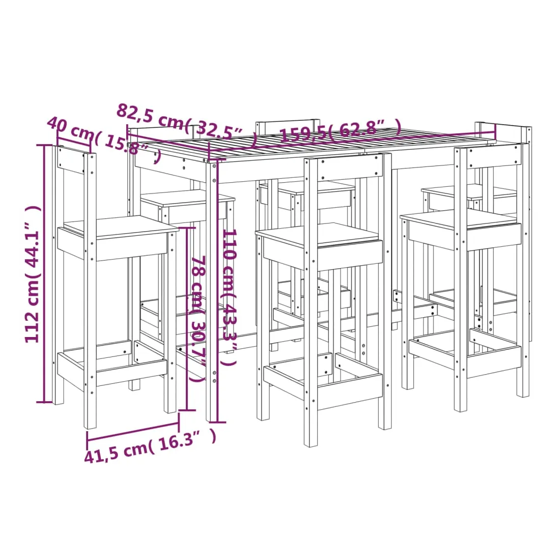 • Dimensions de la table de bar : 159,5 x 82,5 x 110 cm (l x P x H)