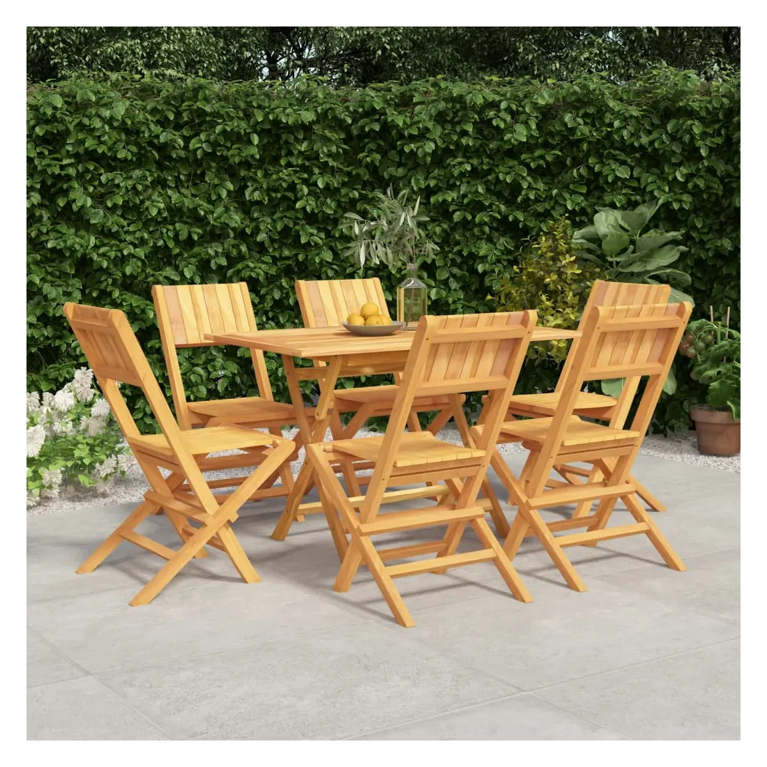 Détendez-vous et profitez d'un thé et de repas agréables avec votre famille et vos amis grâce à cet ensemble de salle à manger de jardin en bois classique ! Bois de teck massif : l'ensemble de salle à manger est fabriqué en bois de teck massif. Le bois de teck massif est un matériau naturel magnifique. Il a été chevronné, séché au four, puis sablé finement pour lui donner une apparence très lisse. Le bois de teck est connu pour sa résistance exceptionnelle et sa résistance aux intempéries.Fonction pliable : l'ensemble de salle à manger d'extérieur peut être plié pour économiser de l'espace lorsqu'il n'est pas utilisé.Expérience confortable : le dossier de la chaise de jardin vous offre un excellent soutien, offrant une expérience confortable optimale.Dessus de table robuste : le dessus de table robuste de la table à manger est parfait pour placer des repas, des boissons, des vases, des bols de fruits ou d'autres objets décoratifs.Trou pour parasol : le dessus de table est doté d'un trou pour parasol, ce qui vous permet de fixer facilement un parasol pour créer un coin ombragé.Design à lattes : la chaise à manger d'extérieur conçue avec un design à lattes est simple et intemporelle. Remarque :Pour que vos meubles d'extérieur restent beaux, nous vous recommandons de les protéger avec une housse imperméable.