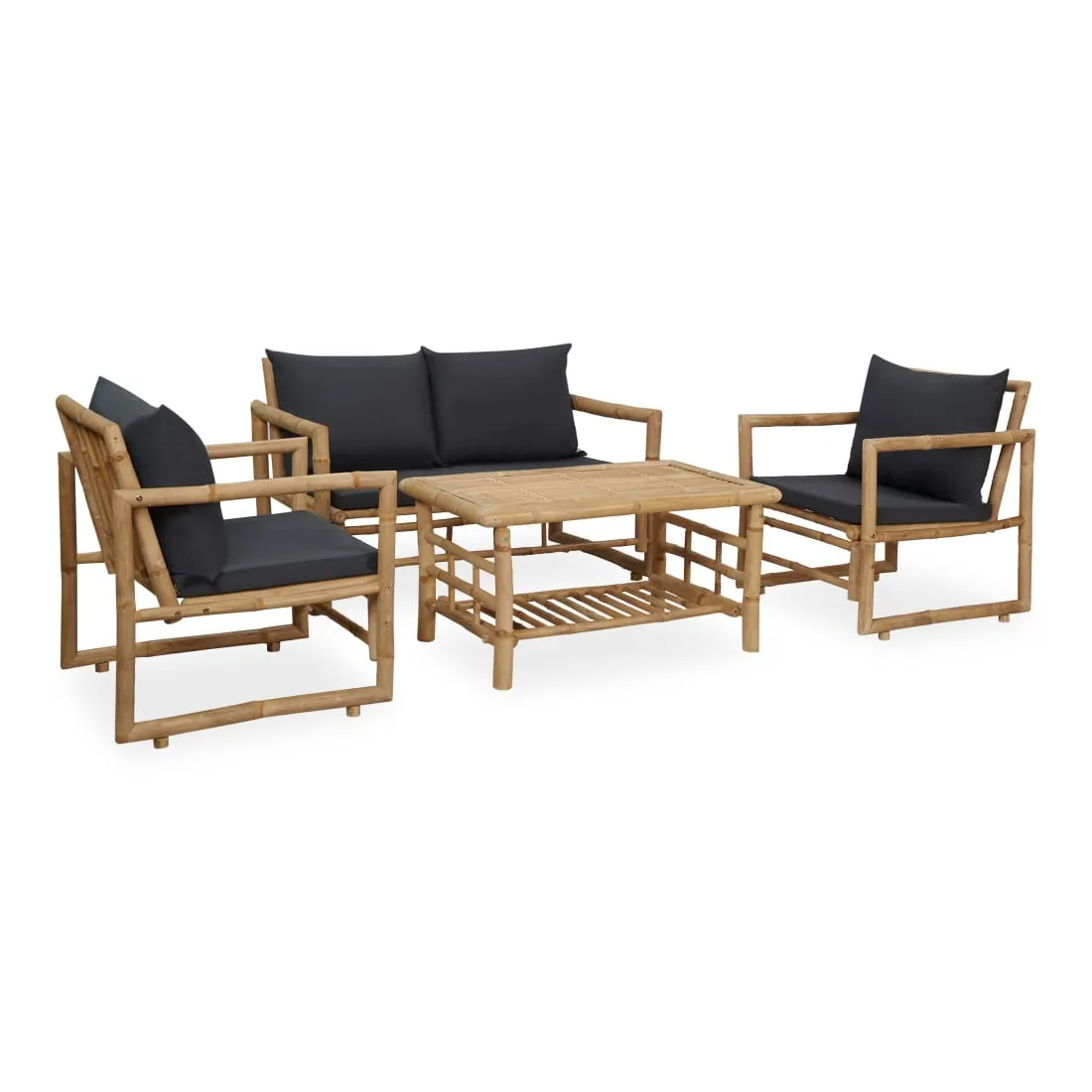 Passez un merveilleux moment avec votre famille ou vos amis grâce à cet ensemble de salon de jardin au design traditionnel. Cet ensemble se compose d'un banc, de deux chaises et d'une table. Ils sont fabriqués en bambou, ce qui les rend robustes et faciles à nettoyer. Le siège et le dossier à lattes offrent un excellent soutien. De plus, les coussins rembourrés ajoutent un confort supplémentaire. Cet ensemble d'aspect naturel ajouteront un élément rustique à votre jardin ou à tout autre espace extérieur. Remarque : afin de prolonger la durée de vie des meubles d'extérieur, nous vous recommandons de les protéger avec une housse imperméable.