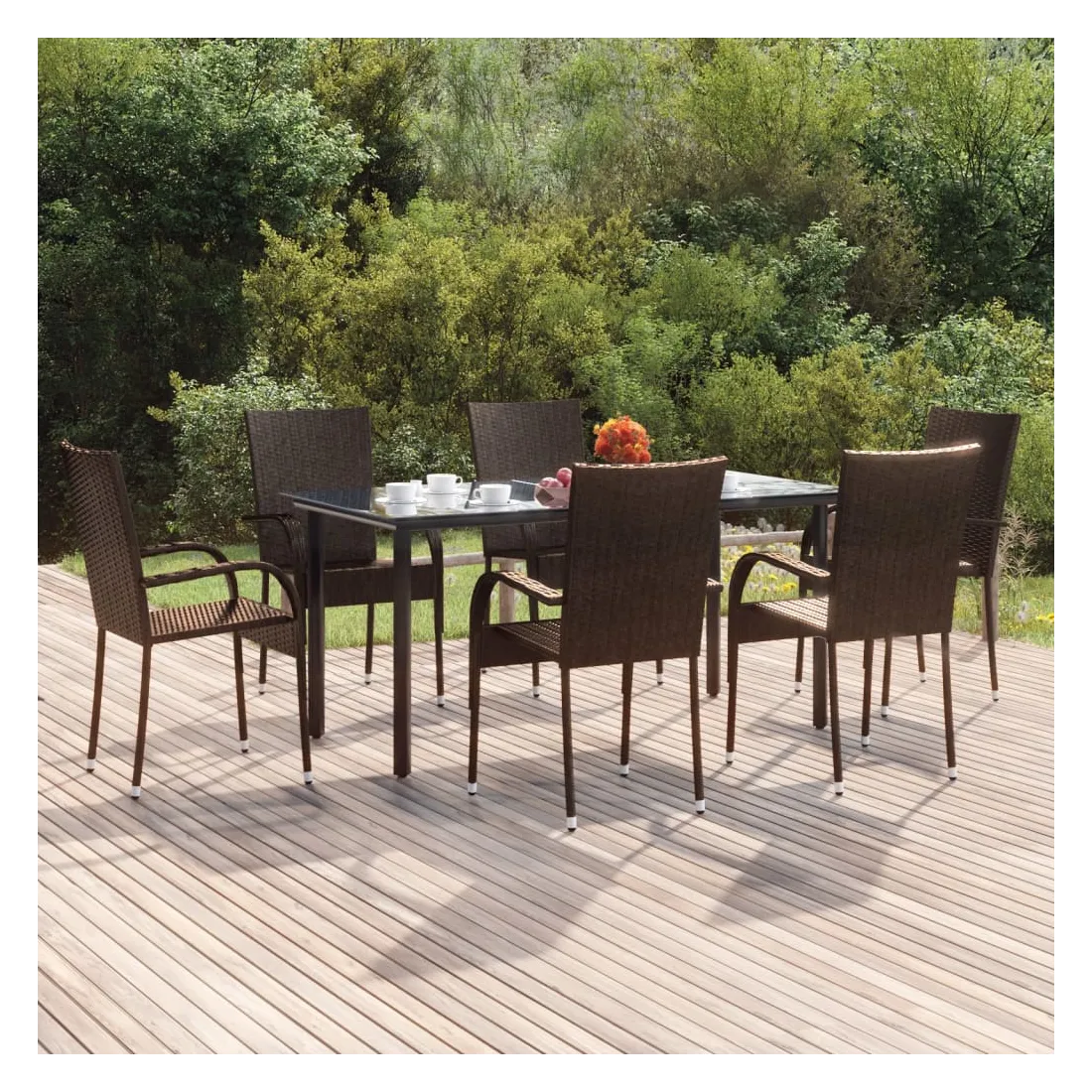 Cet ensemble de salle à manger de jardin est un excellent choix pour manger ou vous détendre dans l'espace extérieur ! Matériau durable : la résine tressée, également connue sous le nom de rotin poly, résiste aux intempéries et est facile à nettoyer. Elle reste belle à l'extérieur pendant une longue période. Elle offre une excellente qualité, commodité et un aspect esthétique.Cadre robuste : les cadres en acier enduit de poudre rendent l'ensemble de salle à manger d'extérieur robuste et stable pour une utilisation quotidienne à l'extérieur.Dessus de table pratique : le dessus lisse de la table de salle à manger est en verre trempé, facile à nettoyer avec un chiffon humide. De plus, le dessus robuste est parfait pour placer des repas, des boissons et d'autres objets décoratifs.Conception flexible : grâce à leur construction légère, ces chaises d'extérieur sont faciles à déplacer et peuvent être empilées pour économiser de l'espace lorsqu'elles ne sont pas utilisées. Remarque :Afin de prolonger la durée de vie de votre mobilier d'extérieur, nous vous recommandons de le protéger avec une housse imperméable.Chaque produit est livré avec un manuel de montage dans la boîte pour un montage facile.