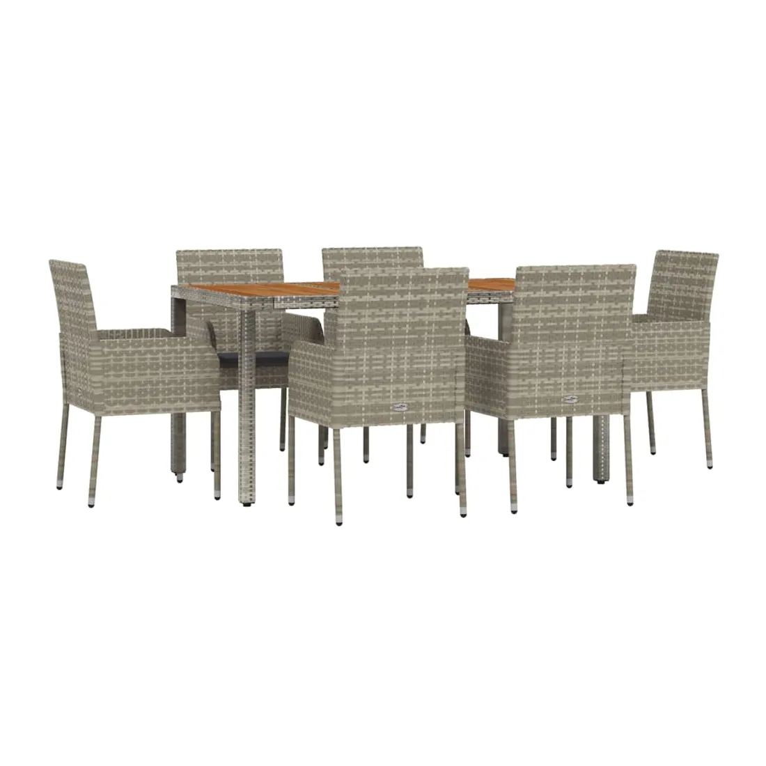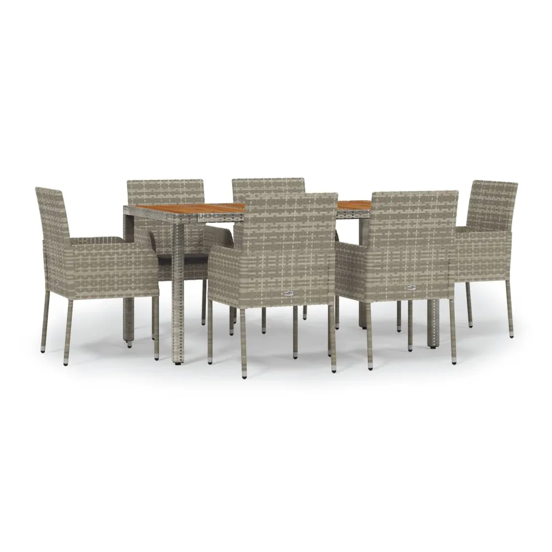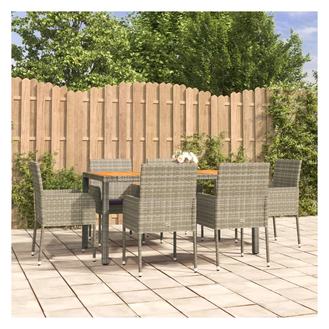 Cet ensemble de salle à manger de jardin tendance, au design élégant et contemporain, est un excellent choix pour manger ou vous détendre dans votre jardin. Matériau résistant aux intempéries : la résine tressée, également connue sous le nom de rotin poly, résiste aux intempéries et est facile à nettoyer. Elle reste belle à l'extérieur pendant une longue période. Elle offre une excellente qualité, commodité et un aspect esthétique.Cadre robuste : les cadres en acier enduit de poudre rendent l'ensemble de salle à manger d'extérieur robuste et stable pour une utilisation quotidienne à l'extérieur.Dessus de table pratique : le dessus de table en bois d'acacia massif est parfait pour placer des boissons, des aliments et des décorations. Il a une belle apparence et est facile à nettoyer.Conception modulaire : l'ensemble de salle à manger de jardin est flexible et facile à déplacer, vous pouvez donc le combiner avec d'autres segments modulaires dans la boutique en ligne pour créer vos propres configurations d'ensemble de salle à manger de jardin !Expérience d'assise confortable : le dossier ajoute un confort d'assise supplémentaire à la chaise de jardin. De plus, les coussins bien rembourrés vous permettent de vous asseoir confortablement. Bon à savoir :Pour faciliter au maximum le montage, chaque produit est livré avec des instructions. Remarque :Pour que vos meubles d'extérieur restent beaux, nous vous recommandons de les protéger avec une housse imperméable.