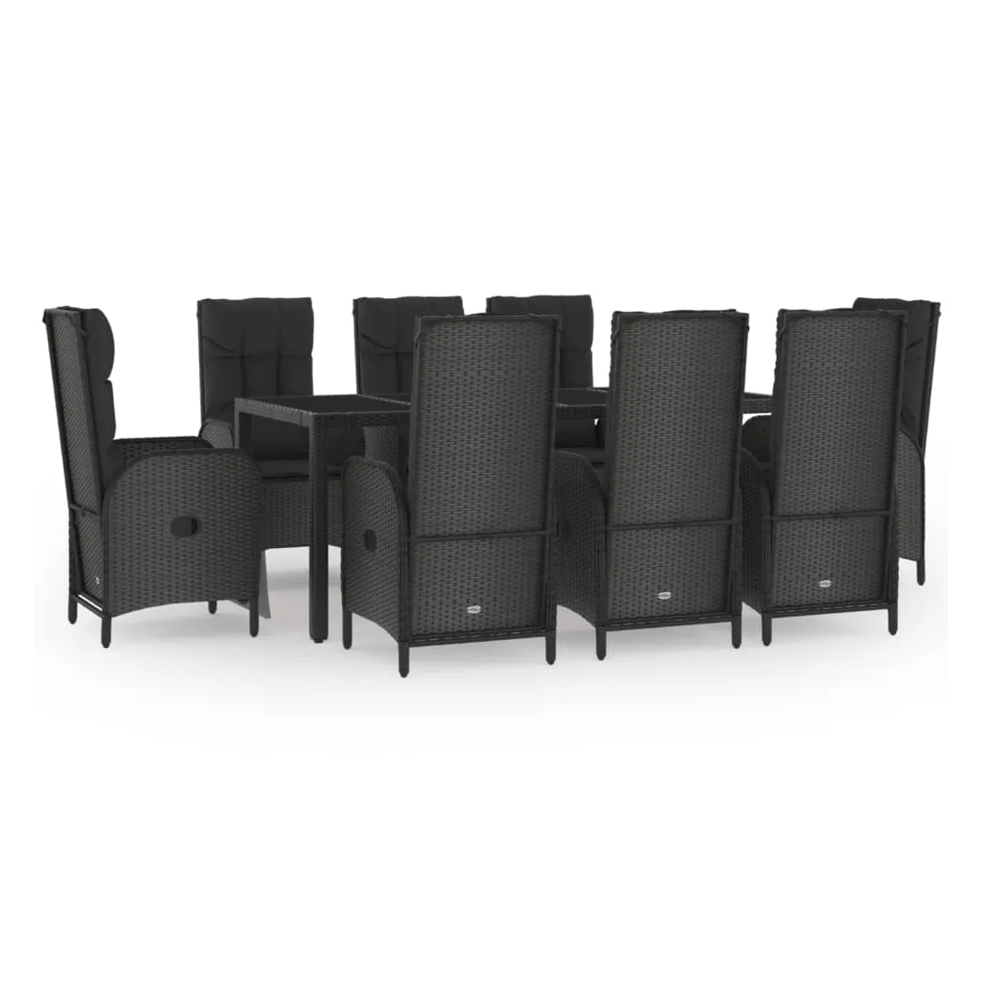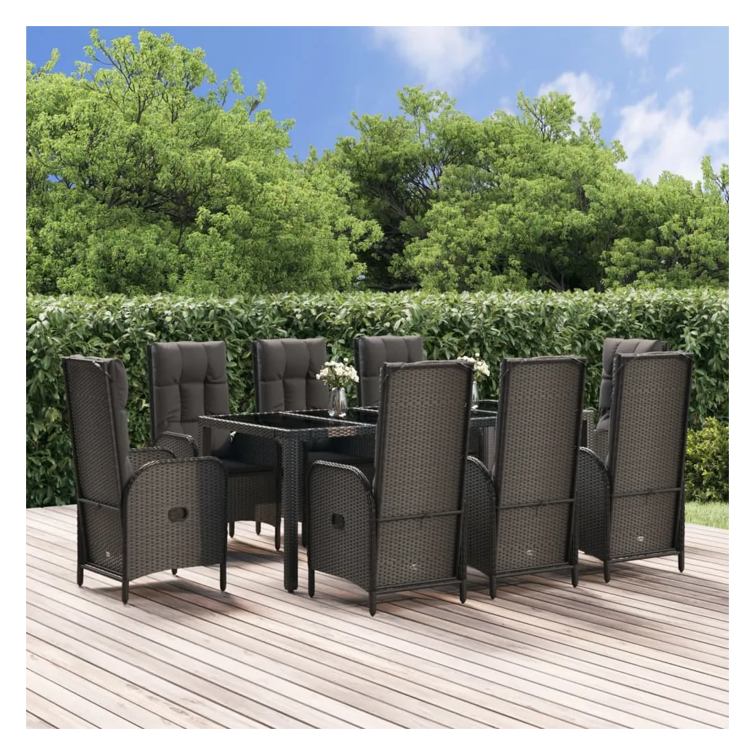Cet ensemble de salle à manger de jardin tendance, au design élégant et contemporain, est un excellent choix pour manger ou vous détendre dans votre jardin. Matériau résistant aux intempéries : la résine tressée, également connue sous le nom de rotin poly, résiste aux intempéries et est facile à nettoyer. Elle reste belle à l'extérieur pendant une longue période. Elle offre une excellente qualité, commodité et un aspect esthétique.Cadre robuste : les cadres en acier enduit de poudre rendent l'ensemble de salle à manger d'extérieur robuste et stable pour une utilisation quotidienne à l'extérieur.Dessus de table pratique : le dessus lisse de la table de jardin est en verre trempé, facile à nettoyer avec un chiffon humide. De plus, le dessus robuste est parfait pour placer des repas, des boissons et d'autres objets décoratifs.Fonction d'inclinaison : les chaises de jardin sont spécialement conçues avec une fonction d'inclinaison afin que vous puissiez régler le dossier selon votre confort.Expérience d'assise confortable : le dossier ajoute un confort d'assise supplémentaire à la chaise de jardin. De plus, les coussins bien rembourrés vous permettent de vous asseoir confortablement. Bon à savoir :Pour faciliter au maximum le montage, chaque produit est livré avec des instructions. Remarque :Pour que vos meubles d'extérieur restent beaux, nous vous recommandons de les protéger avec une housse imperméable.