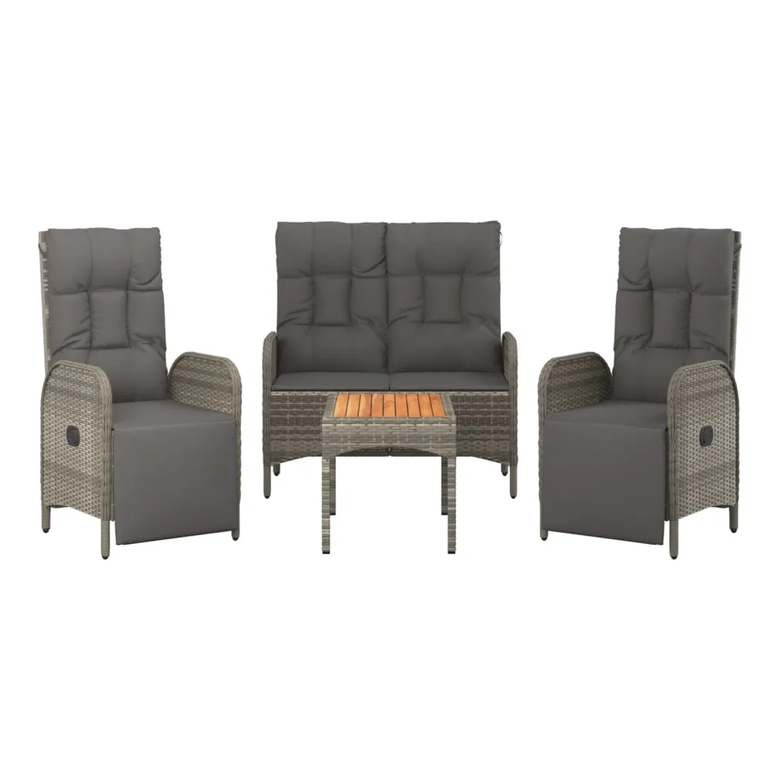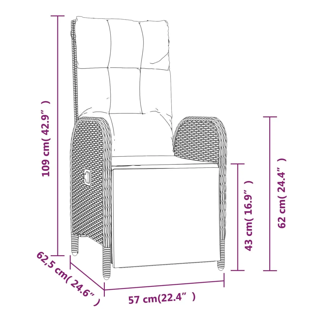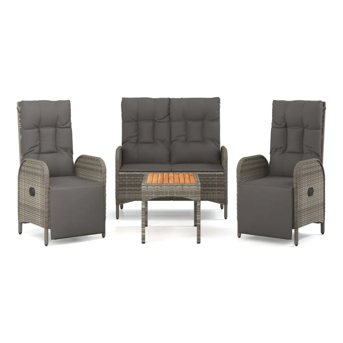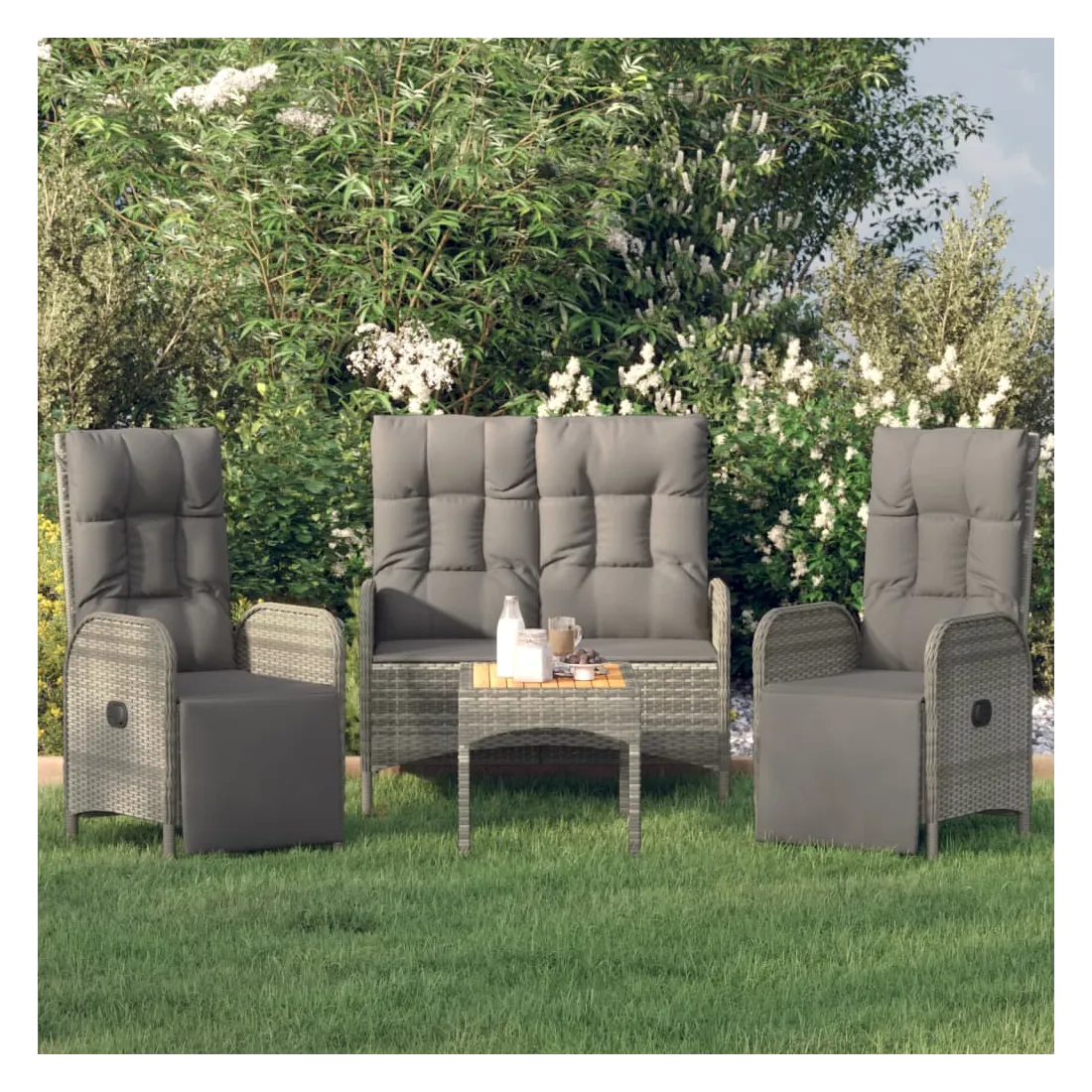Cet ensemble de salle à manger de jardin tendance, au design élégant et contemporain, est un excellent choix pour manger ou vous détendre dans votre jardin. Matériau résistant aux intempéries : la résine tressée, également connue sous le nom de rotin poly, résiste aux intempéries et est facile à nettoyer. Elle reste belle à l'extérieur pendant une longue période. Elle offre une excellente qualité, commodité et un aspect esthétique.Cadre robuste : les cadres en acier enduit de poudre rendent l'ensemble de salle à manger d'extérieur robuste et stable pour une utilisation quotidienne à l'extérieur.Dessus de table pratique : le dessus de table en bois d'acacia massif est parfait pour placer des boissons, des aliments et des décorations. Il a une belle apparence et est facile à nettoyer.Fonction d'inclinaison : les chaises de jardin sont spécialement conçues avec une fonction d'inclinaison afin que vous puissiez régler le dossier selon votre confort.Expérience d'assise confortable : le dossier ajoute un confort d'assise supplémentaire à la chaise de jardin. De plus, les coussins bien rembourrés vous permettent de vous asseoir confortablement. Bon à savoir :Pour faciliter au maximum le montage, chaque produit est livré avec des instructions. Remarque :Pour que vos meubles d'extérieur restent beaux, nous vous recommandons de les protéger avec une housse imperméable.