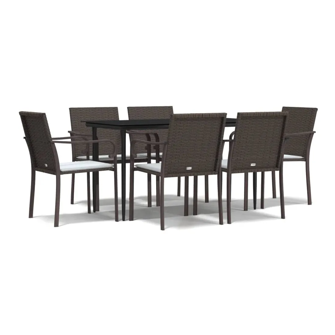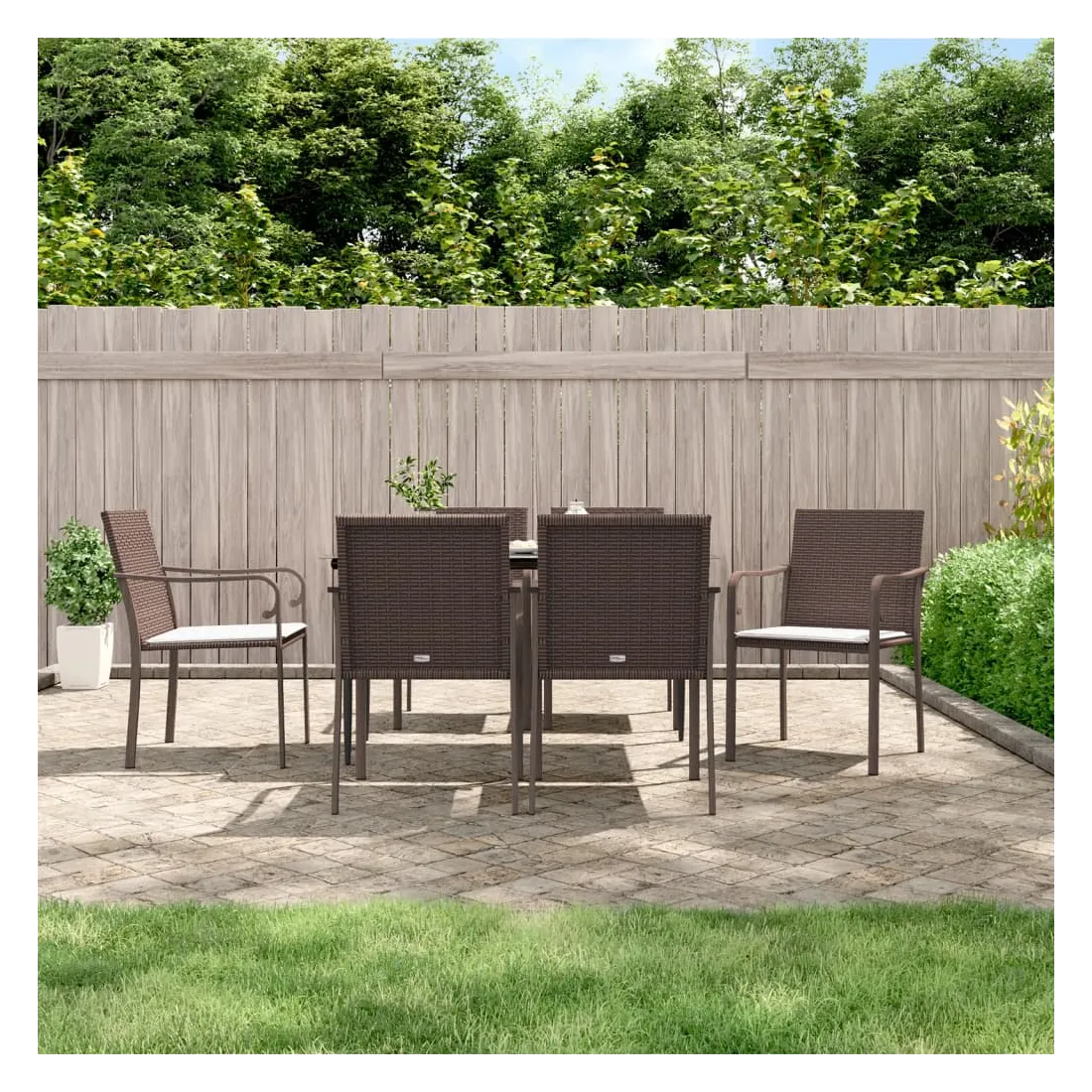 Cet ensemble à manger de jardin, combinant à la fois style et fonctionnalité, est sûrement destiné à être la pièce maîtresse de votre jardin, terrasse et de tout autre espace de vie. Matériau résistant aux intempéries : la résine tressée, également connue sous le nom de rotin poly, résiste aux intempéries et est facile à nettoyer. Elle reste belle à l'extérieur pendant une longue période. Elle offre une excellente qualité, commodité et un aspect esthétique.Cadre robuste et stable : les cadres en acier rendent l'ensemble à manger robuste et stable pour une utilisation quotidienne à l'extérieur.Dessus de table pratique : le plateau lisse de la table à manger est en verre trempé facile à nettoyer avec un chiffon humide. De plus, il offre un excellent support pour contenir vos repas, boissons et autres objets décoratifs.Assise confortable : la chaise de salle à manger est conçue avec des accoudoirs pour vous offrir une expérience d'assise confortable. Le coussin de siège épais et rembourré offre un confort ultime pendant votre temps d'assise. Remarque :Pour que vos meubles d'extérieur restent beaux, nous vous recommandons de les protéger avec une housse imperméable.