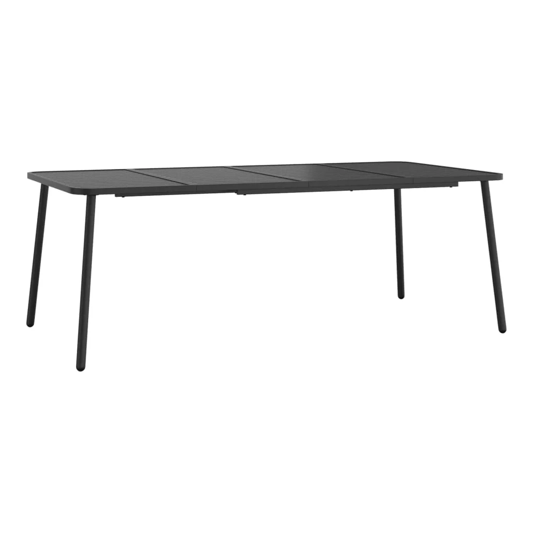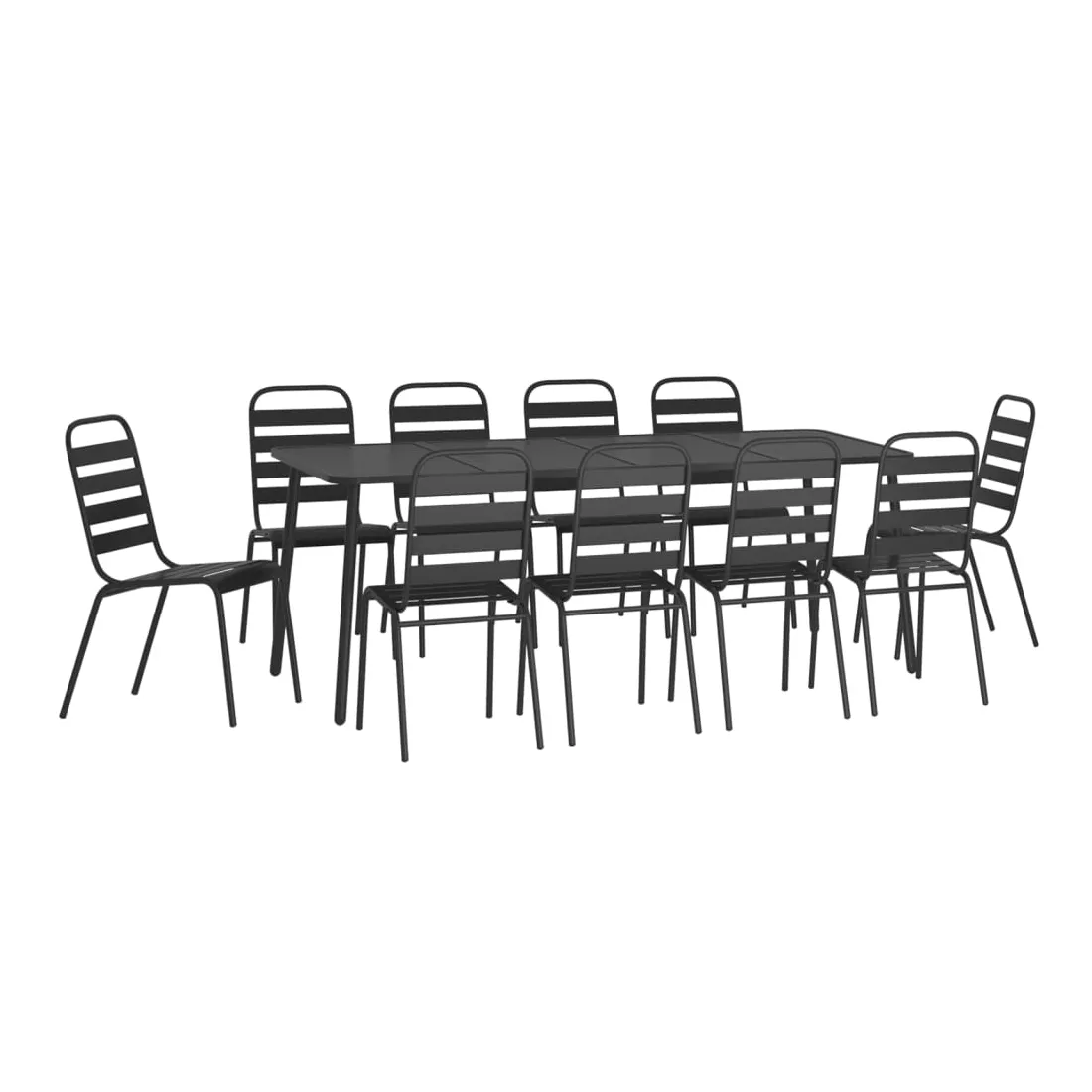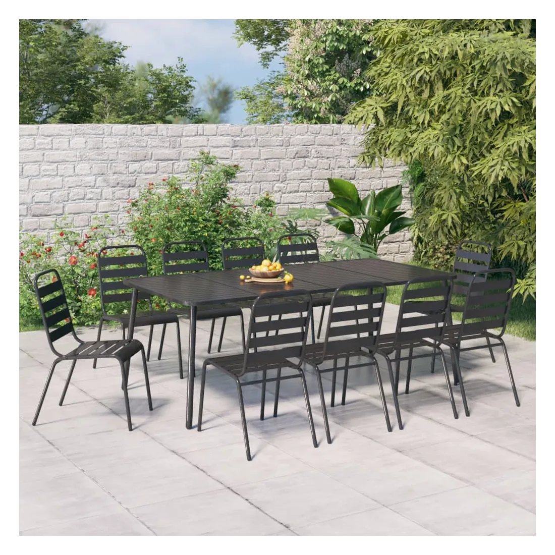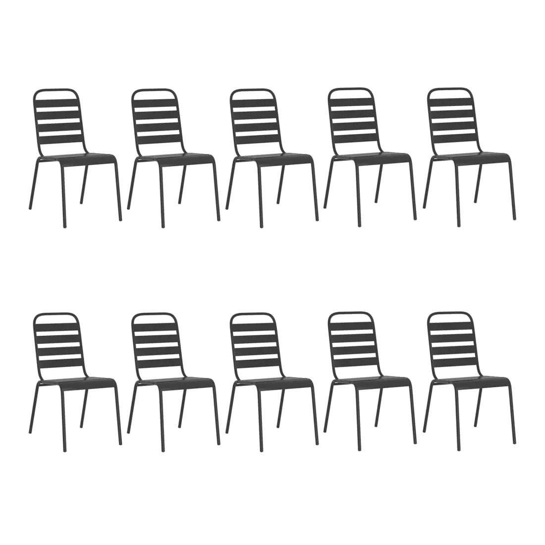 Cet ensemble de salle à manger de jardin tendance, au design élégant et contemporain, est un choix parfait pour vous détendre dans votre jardin. Matériau robuste : l'acier est un matériau exceptionnellement dur et solide. Il offre robustesse et stabilité. Le revêtement par poudre et le revêtement électronique de l'acier créent une couche protectrice contre l'usure et la corrosion.Cadre stable : le cadre en acier enduit de poudre et e-coated assure la robustesse et la stabilité de l'ensemble de salle à manger.Fonction empilable : les chaises de salle à manger sont empilables pour économiser de l'espace lorsqu'elles ne sont pas utilisées.Table pratique : le dessus robuste de la table à manger est parfait pour placer des repas, des boissons et d'autres objets décoratifs.Design à lattes : la table à manger de jardin avec un design à lattes est simple et intemporelle et convient aux balcons, porches, jardins, terrasses, etc. Remarque :Pour que vos meubles d'extérieur restent beaux, nous vous recommandons de les protéger avec une housse imperméable.