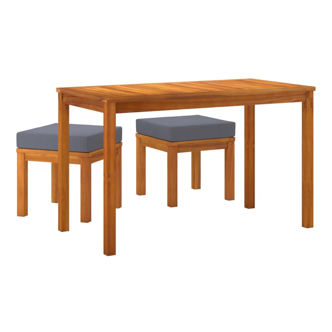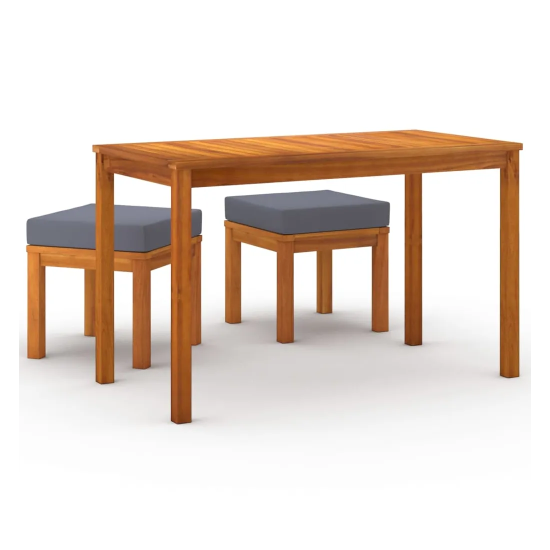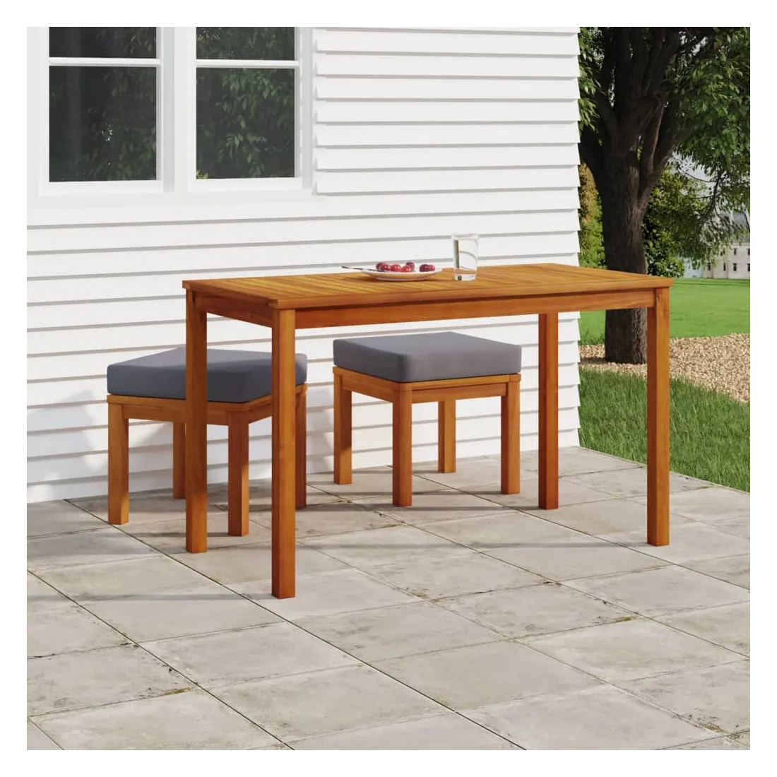 Cet ensemble à dîner de jardin avec coussins est un excellent supplément à votre jardin, terrasse ou patio. Matériau durable : le bois d'acacia massif est un matériau naturel magnifique. Le bois d'acacia un bois dur tropical, qui est dense, robuste et durable.Cadre robuste : le cadre en bois de l'ensemble de salle à manger d'extérieur garantit la solidité et la stabilité.Coussin souple : les coussins d'assise bien rembourrés du tabouret d'extérieur apportent le plus grand confort.Dessus stable : le dessus de table stable de la table à dîner vous offre de l'espace pour placer des collations, des paniers de fruits, des objets décoratifs, ainsi que divers autres articles essentiels. Remarque :Chaque produit est livré avec un manuel de montage dans la boîte pour un montage facile.Afin de prolonger la durée de vie de votre mobilier d'extérieur, nous vous recommandons de le protéger avec une housse imperméable.La table est plus basse que les tables à manger habituelles, et elle est particulièrement adaptée pour être combinée avec des ensembles de canapés de jardin.