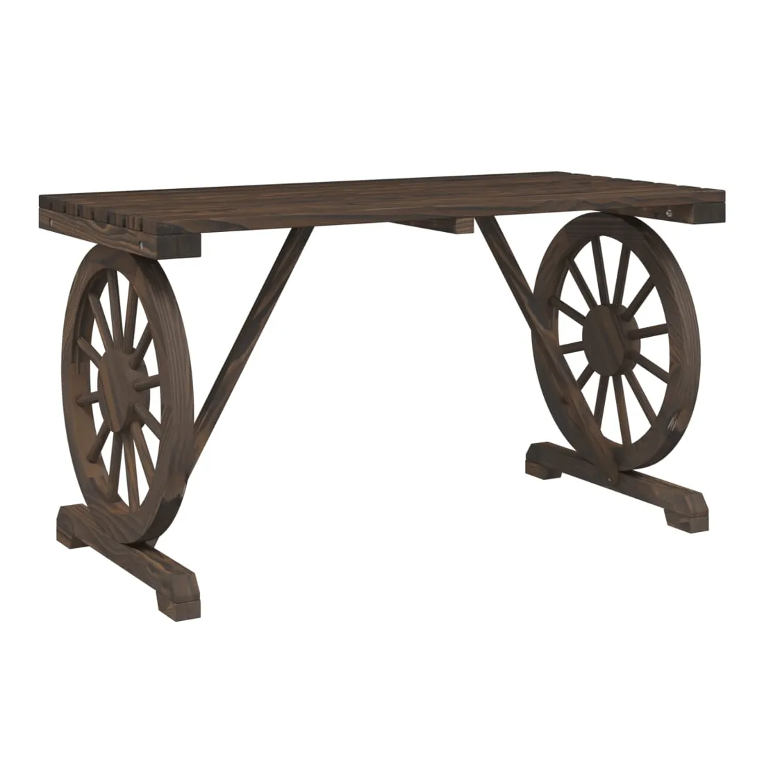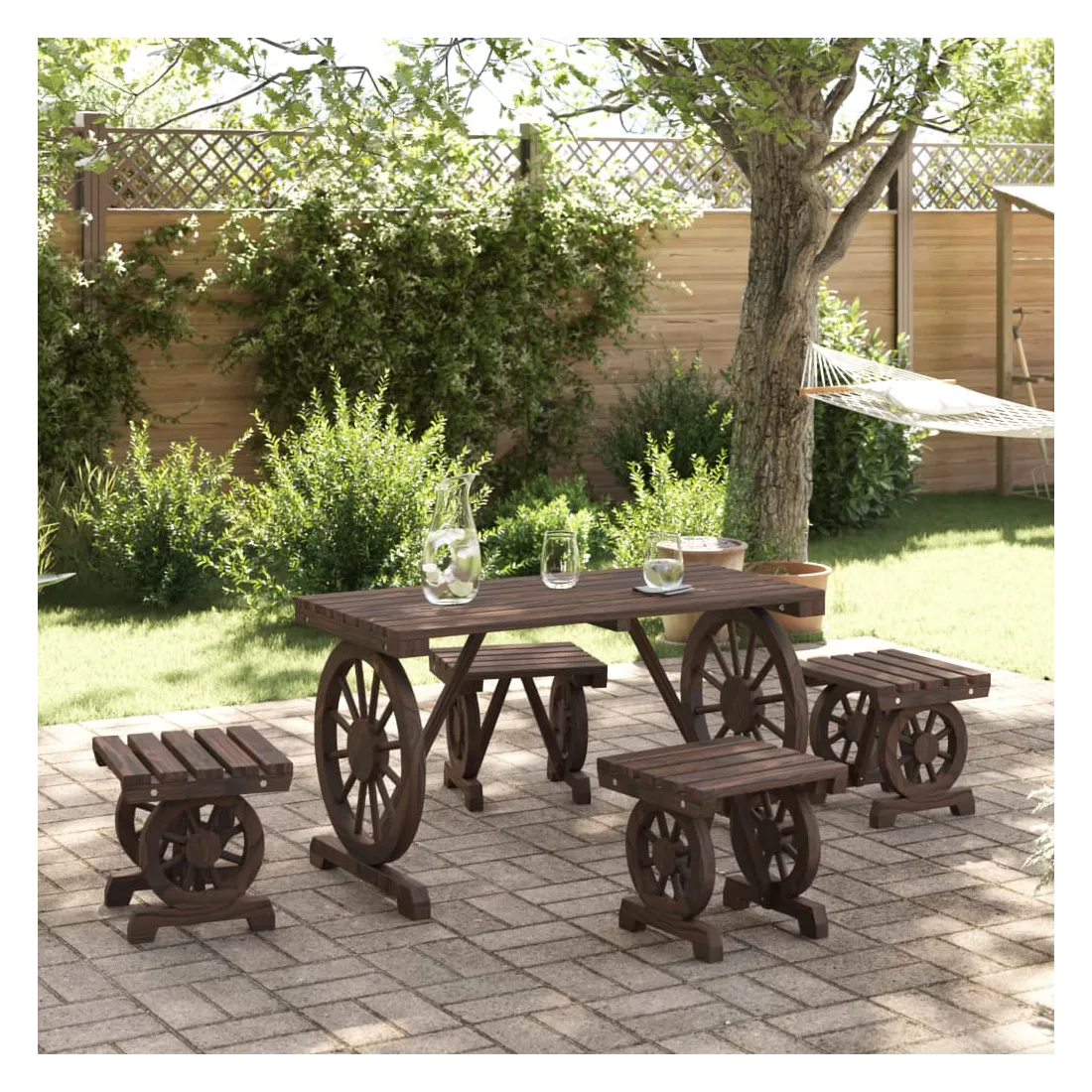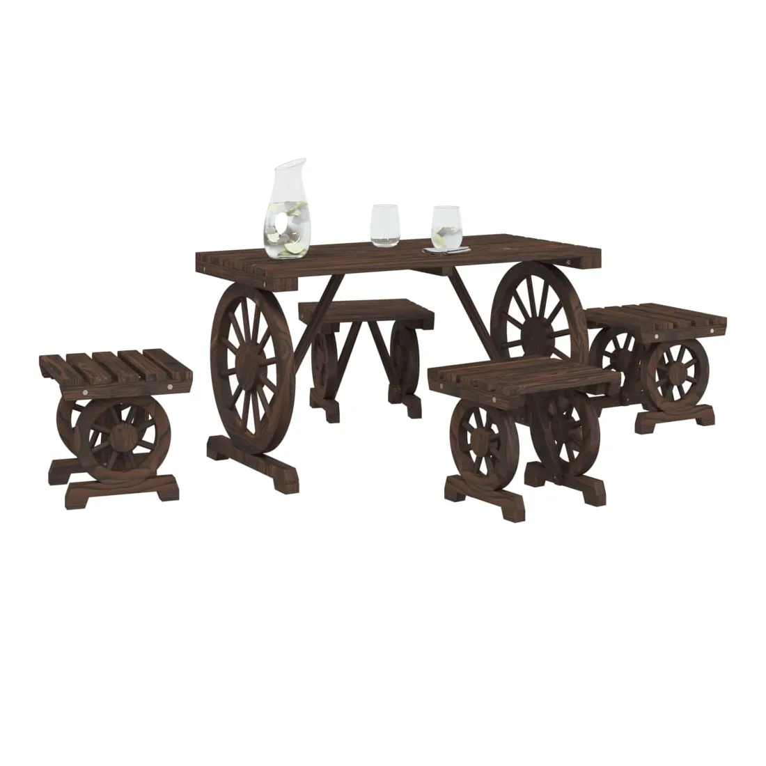 vidaXLProfitez d'un bon repas ou d'un thé l'après-midi dans votre espace extérieur avec cet ensemble à manger de jardin en bois ! Bois de sapin massif : le bois de sapin massif est un matériau beau et durable qui conserve son intégrité même lorsqu'il est exposé à l'humidité. Il ne sèche pas et ne se déforme pas, ce qui en fait un choix fiable.Table pratique : la table de jardin est parfaite pour placer vos boissons, aliments et autres objets de décoration.Design attrayant : l’ensemble à manger d’extérieur présente un design en forme de roue de chariot qui offre un affichage accrocheur sous tous les angles. Bon à savoir :Pour que vos meubles d'extérieur restent beaux, nous vous recommandons de les protéger avec une housse imperméable.