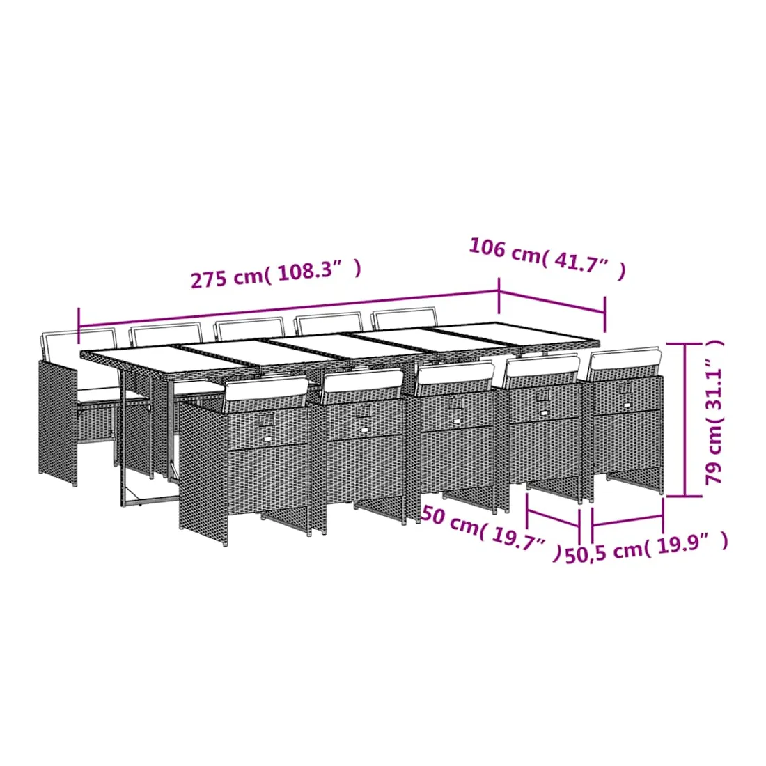 vidaXLCet ensemble de salle à manger de jardin est un excellent choix pour les repas en plein air ou pour vous détendre dans le jardin, dans l'arrière-cour ou sur la terrasse. Matériau durable : la résine tressée, également connue sous le nom de poly rotin, est un matériau synthétique solide et nécessitant peu d'entretien qui ressemble au rotin naturel. Il est léger, facile à nettoyer et couramment utilisé pour les meubles d'extérieur en raison de sa durabilité et de ses propriétés de résistance aux intempéries.Rangement compact : ces chaises sont dotées d'un dossier rabattable, ce qui permet de les ranger facilement sous la table. Une fois pliées, elles se rangent parfaitement sous la table, formant un cube peu encombrant. Expérience d'assise confortable : ce mobilier d'extérieur, doté de coussins épais, offre une expérience d'assise confortable.Housse amovible et lavable : ces coussins de siège sont dotés de housses amovibles pour un lavage et un entretien faciles.Dessus en verre : le dessus de la table d'extérieur est fabriqué en verre trempé solide et durable, ce qui le rend facile à nettoyer avec un chiffon humide et ajoute une touche d'élégance à votre espace extérieur. Bon à savoir : Pour que vos meubles d'extérieur restent beaux, nous vous recommandons de les protéger avec une housse imperméable.