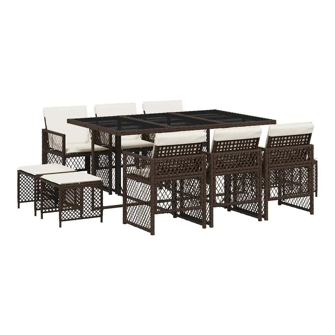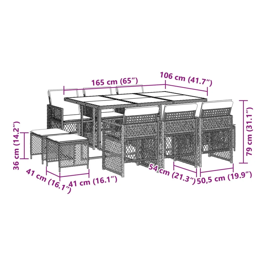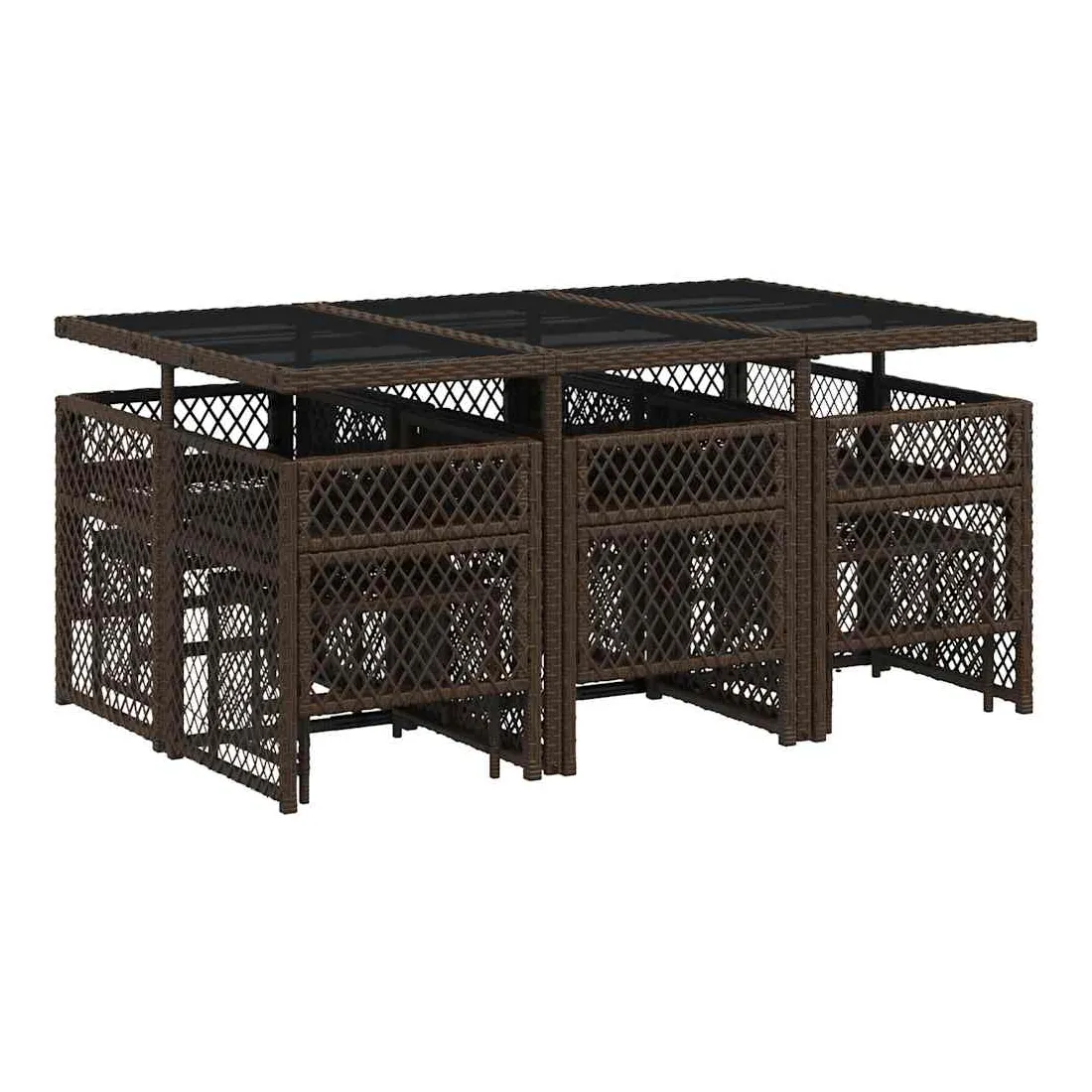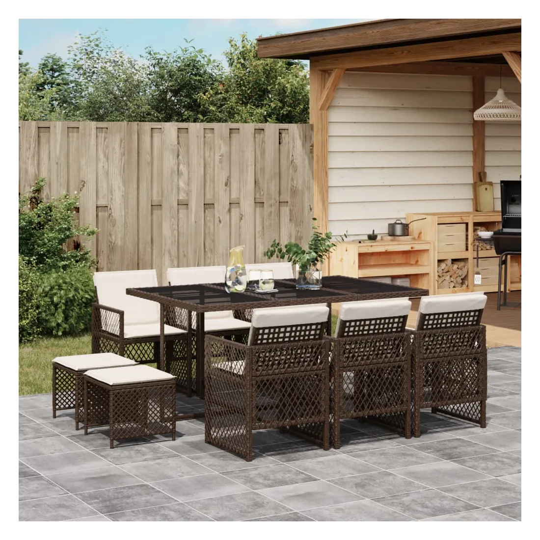 Cet ensemble de salle à manger de jardin est un excellent choix pour les repas en plein air ou pour vous détendre dans le jardin, l'arrière-cour ou le patio. Matériau durable : la résine tressée, également connue sous le nom de poly rotin, est un matériau synthétique solide et nécessitant peu d'entretien qui ressemble au rotin naturel. Elle est légère, facile à nettoyer et couramment utilisée pour les meubles d'extérieur en raison de sa durabilité et de ses propriétés de résistance aux intempéries. Dessus en verre : le dessus de la table d'extérieur est fabriqué en verre trempé solide et durable, ce qui le rend facile à nettoyer avec un chiffon humide et ajoute une touche d'élégance à votre espace extérieur. Rangement compact : ces chaises sont dotées d'un dossier rabattable, ce qui permet de les ranger facilement sous la table. Une fois pliées, elles se rangent parfaitement sous la table, formant un cube peu encombrant. De plus, les tabourets peuvent également être rangés sous les chaises, maximisant encore davantage l'efficacité de l'espace. Expérience d'assise confortable : ce mobilier d'extérieur, doté de coussins épais, offre une expérience d'assise confortable. Housse amovible et lavable : ces coussins de siège sont dotés de housses amovibles pour un lavage et un entretien faciles. Les housses de coussin de chaise ont un rabat à l'arrière pour une fixation facile aux chaises. Bon à savoir :Pour que vos meubles d'extérieur restent beaux, nous vous recommandons de les protéger avec une housse imperméable.