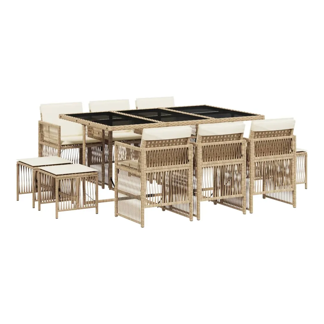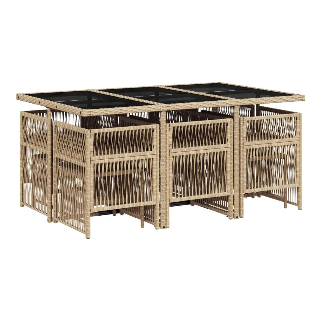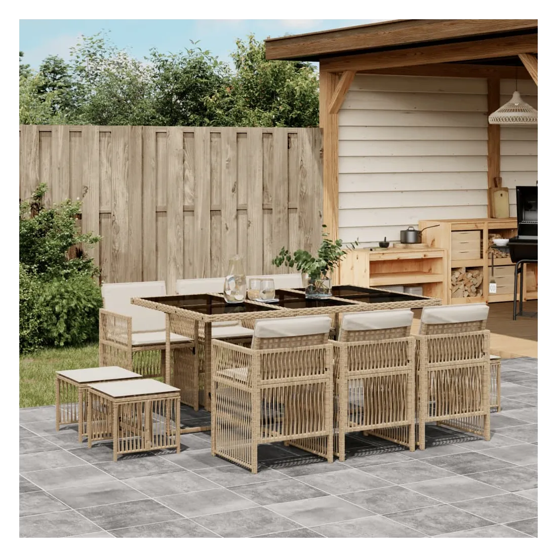 Cet ensemble de salle à manger de jardin est un excellent choix pour les repas en plein air ou pour vous détendre dans le jardin, dans l'arrière-cour ou sur la terrasse. Matériau durable : la résine tressée, également connue sous le nom de poly rotin, est un matériau synthétique solide et nécessitant peu d'entretien qui ressemble au rotin naturel. Il est léger, facile à nettoyer et couramment utilisé pour les meubles d'extérieur en raison de sa durabilité et de ses propriétés de résistance aux intempéries.Rangement compact : ces chaises sont dotées d'un dossier rabattable, ce qui permet de les ranger facilement sous la table. Une fois pliées, elles se rangent parfaitement sous la table, formant un cube peu encombrant. De plus, les tabourets peuvent également être rangés sous les chaises, maximisant encore davantage l'efficacité de l'espace.Expérience d'assise confortable : ce mobilier d'extérieur, doté de coussins épais, offre une expérience d'assise confortable.Housse amovible et lavable : ces coussins sont dotés de housses amovibles pour un lavage et un entretien faciles. Les housses de coussin ont un rabat à l'arrière pour une fixation facile aux dossiers.Dessus en verre : le dessus de la table d'extérieur est fabriqué en verre trempé solide et durable, ce qui le rend facile à nettoyer avec un chiffon humide et ajoute une touche d'élégance à votre espace extérieur. Bon à savoir : Pour que vos meubles d'extérieur restent beaux, nous vous recommandons de les protéger avec une housse imperméable.