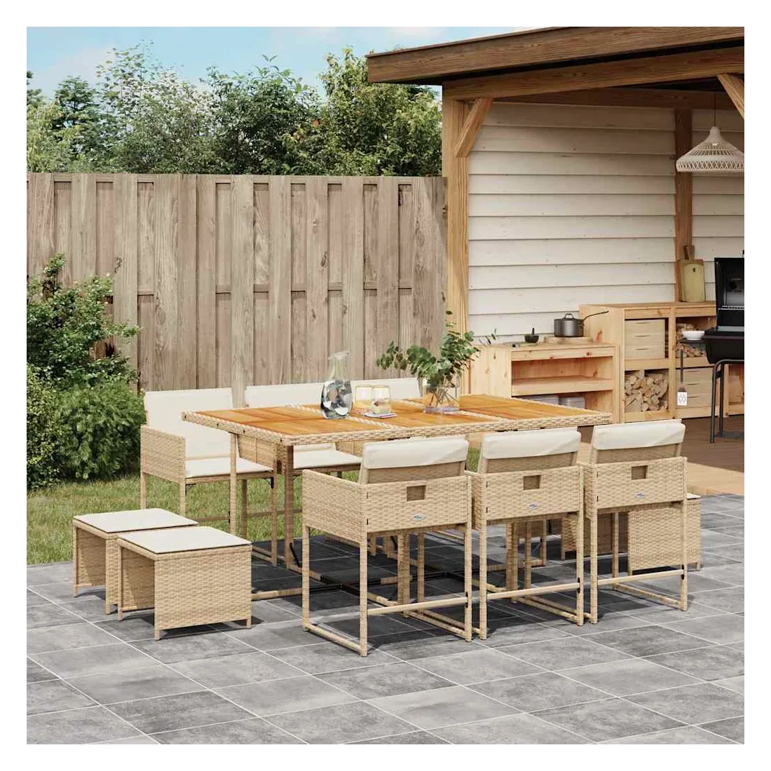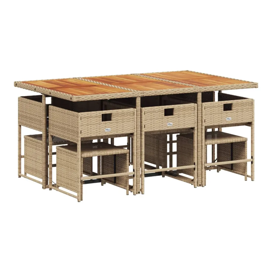 vidaXLCet ensemble de salle à manger de jardin est un excellent choix pour les repas en plein air ou pour vous détendre dans le jardin, dans l'arrière-cour ou sur la terrasse. Matériau durable : la résine tressée, également connue sous le nom de poly rotin, est un matériau synthétique solide et nécessitant peu d'entretien qui ressemble au rotin naturel. Il est léger, facile à nettoyer et couramment utilisé pour les meubles d'extérieur en raison de sa durabilité et de ses propriétés de résistance aux intempéries.Rangement compact : ces chaises sont dotées d'un dossier rabattable, ce qui permet de les ranger facilement sous la table. Une fois pliées, elles se rangent parfaitement sous la table, formant un cube peu encombrant. De plus, les tabourets peuvent également être rangés sous les chaises, maximisant encore davantage l'efficacité de l'espace.Expérience d'assise confortable : ce mobilier d'extérieur, doté de coussins épais, offre une expérience d'assise confortable.Housse amovible et lavable : ces coussins de siège sont dotés de housses amovibles pour un lavage et un entretien faciles. Les housses de coussin ont un rabat à l'arrière pour une fixation facile aux dossiers.Dessus stable et facile à nettoyer : cette table de jardin a un dessus en bois d'acacia robuste, durable et facile à nettoyer avec un chiffon humide. Bon à savoir : Pour que vos meubles d'extérieur restent beaux, nous vous recommandons de les protéger avec une housse imperméable.