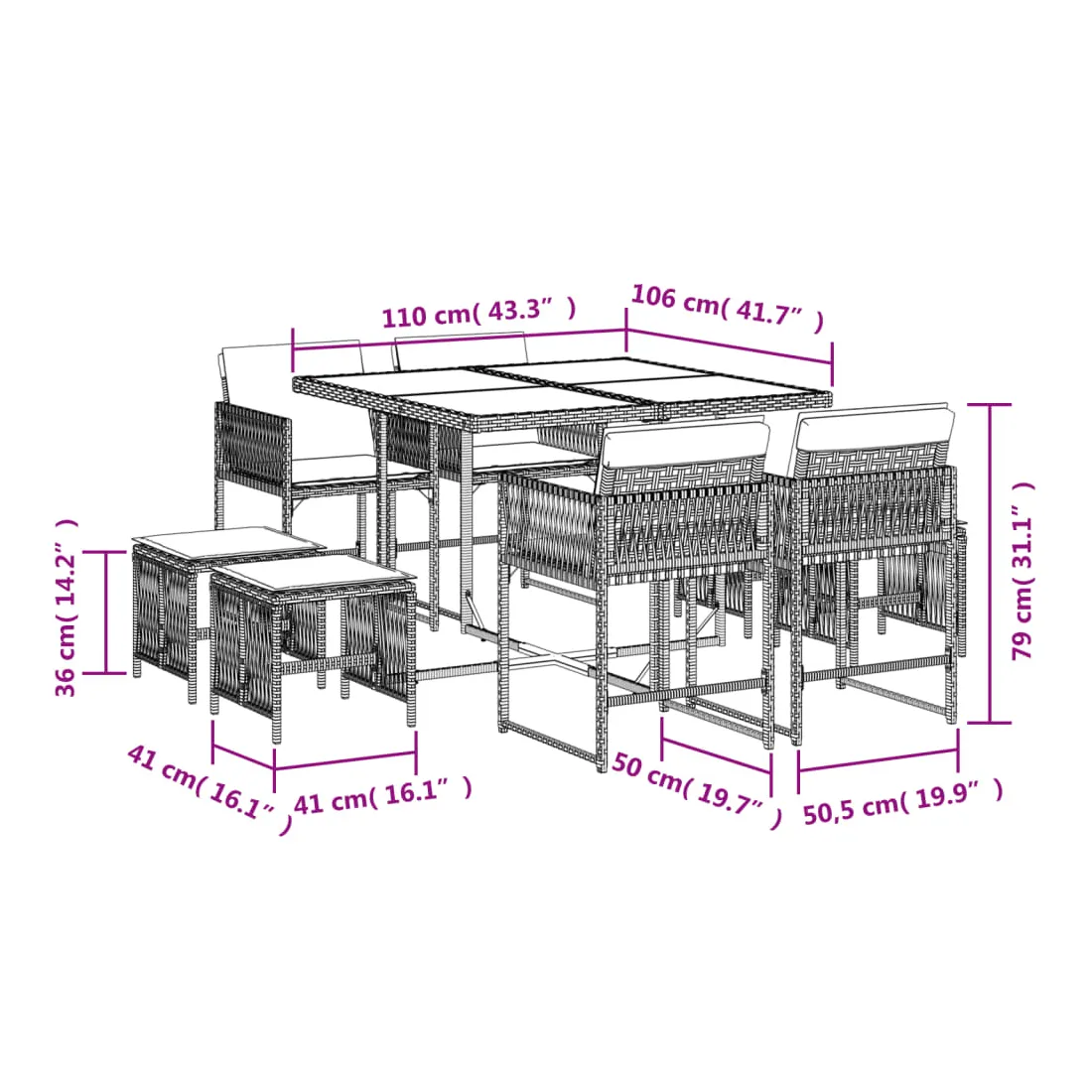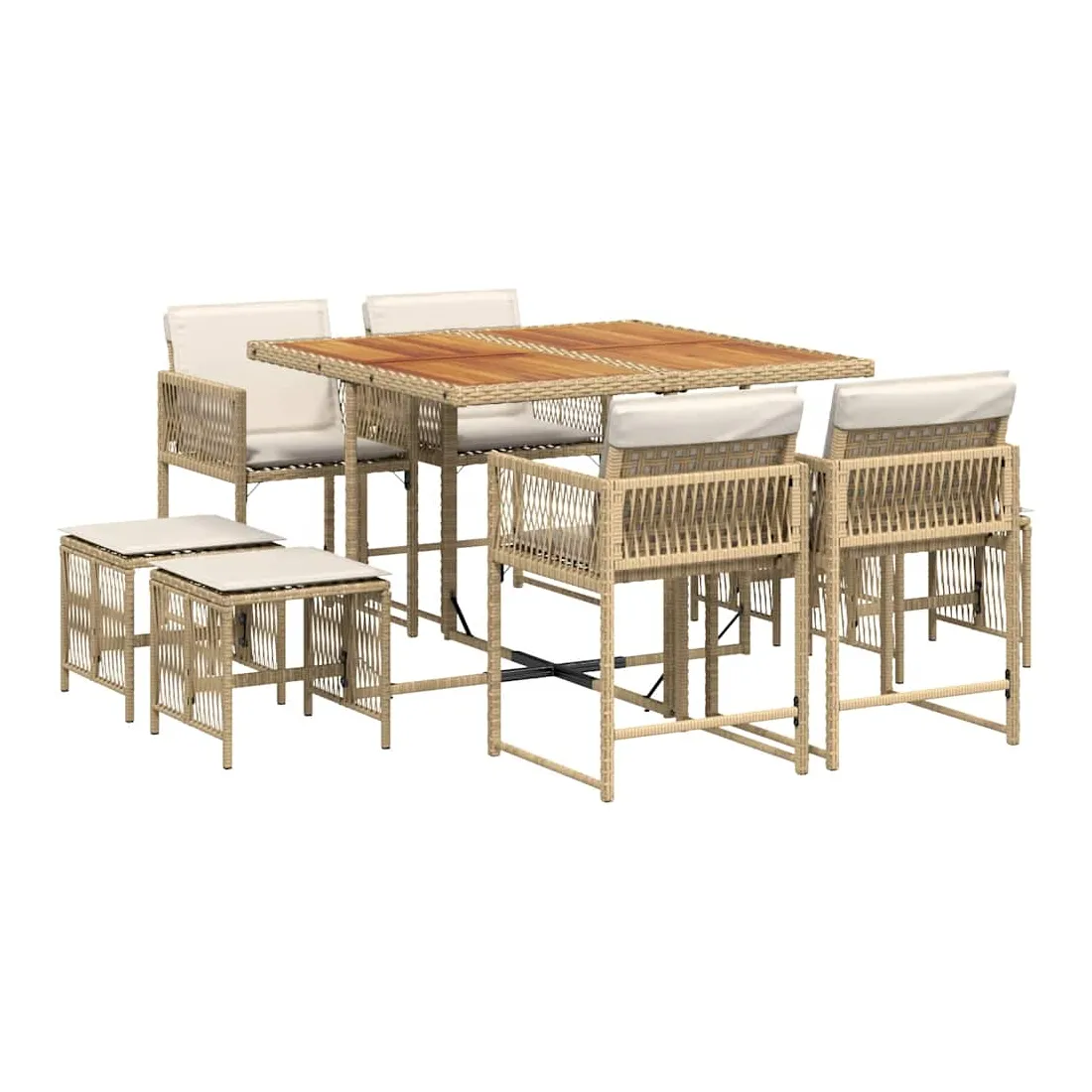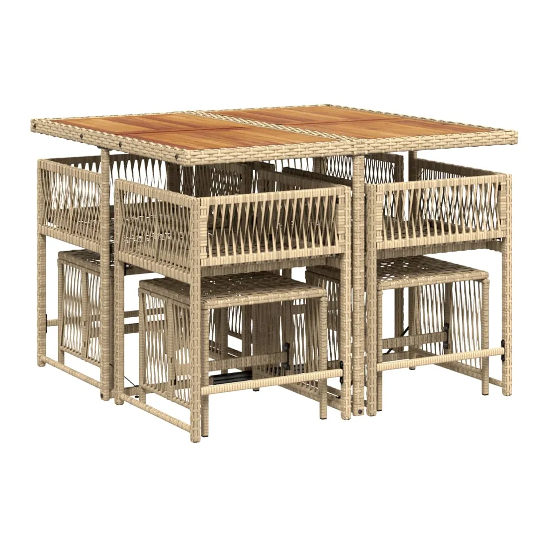 Cet ensemble de salle à manger de jardin est un excellent choix pour les repas en plein air ou pour vous détendre dans le jardin, dans l'arrière-cour ou sur la terrasse. Matériau durable : la résine tressée, également connue sous le nom de poly rotin, est un matériau synthétique solide et nécessitant peu d'entretien qui ressemble au rotin naturel. Il est léger, facile à nettoyer et couramment utilisé pour les meubles d'extérieur en raison de sa durabilité et de ses propriétés de résistance aux intempéries.Rangement compact : ces chaises sont dotées d'un dossier rabattable, ce qui permet de les ranger facilement sous la table. Une fois pliées, elles se rangent parfaitement sous la table, formant un cube peu encombrant. De plus, les tabourets peuvent également être rangés sous les chaises, maximisant encore davantage l'efficacité de l'espace.Expérience d'assise confortable : ce mobilier d'extérieur, doté de coussins épais, offre une expérience d'assise confortable.Housse amovible et lavable : ces coussins de siège sont dotés de housses amovibles pour un lavage et un entretien faciles. Les housses de coussin ont un rabat à l'arrière pour une fixation facile aux dossiers.Dessus stable et facile à nettoyer : cette table de jardin a un dessus en bois d'acacia robuste, durable et facile à nettoyer avec un chiffon humide. Bon à savoir :Pour que vos meubles d'extérieur restent beaux, nous vous recommandons de les protéger avec une housse imperméable.