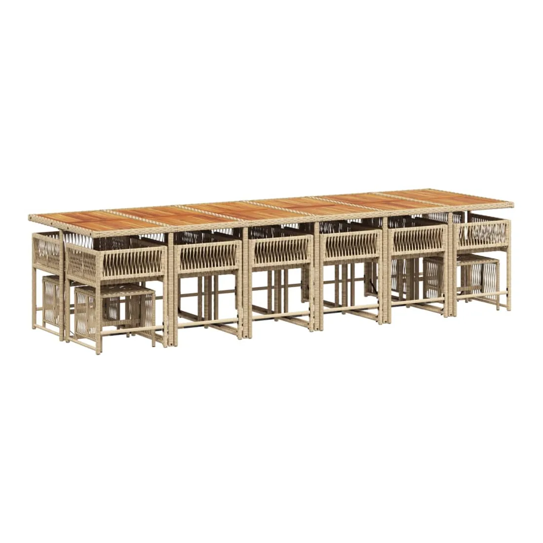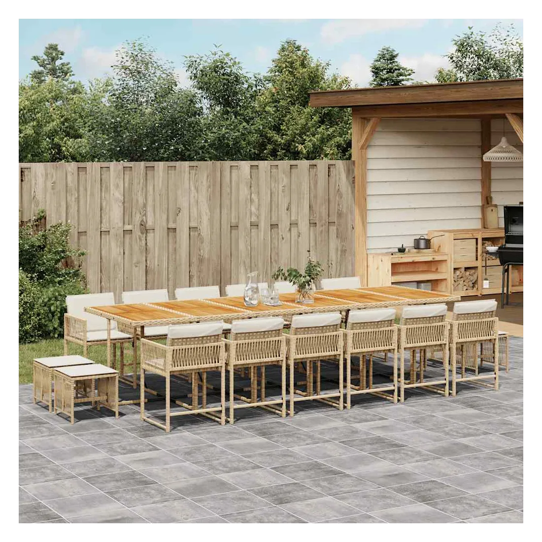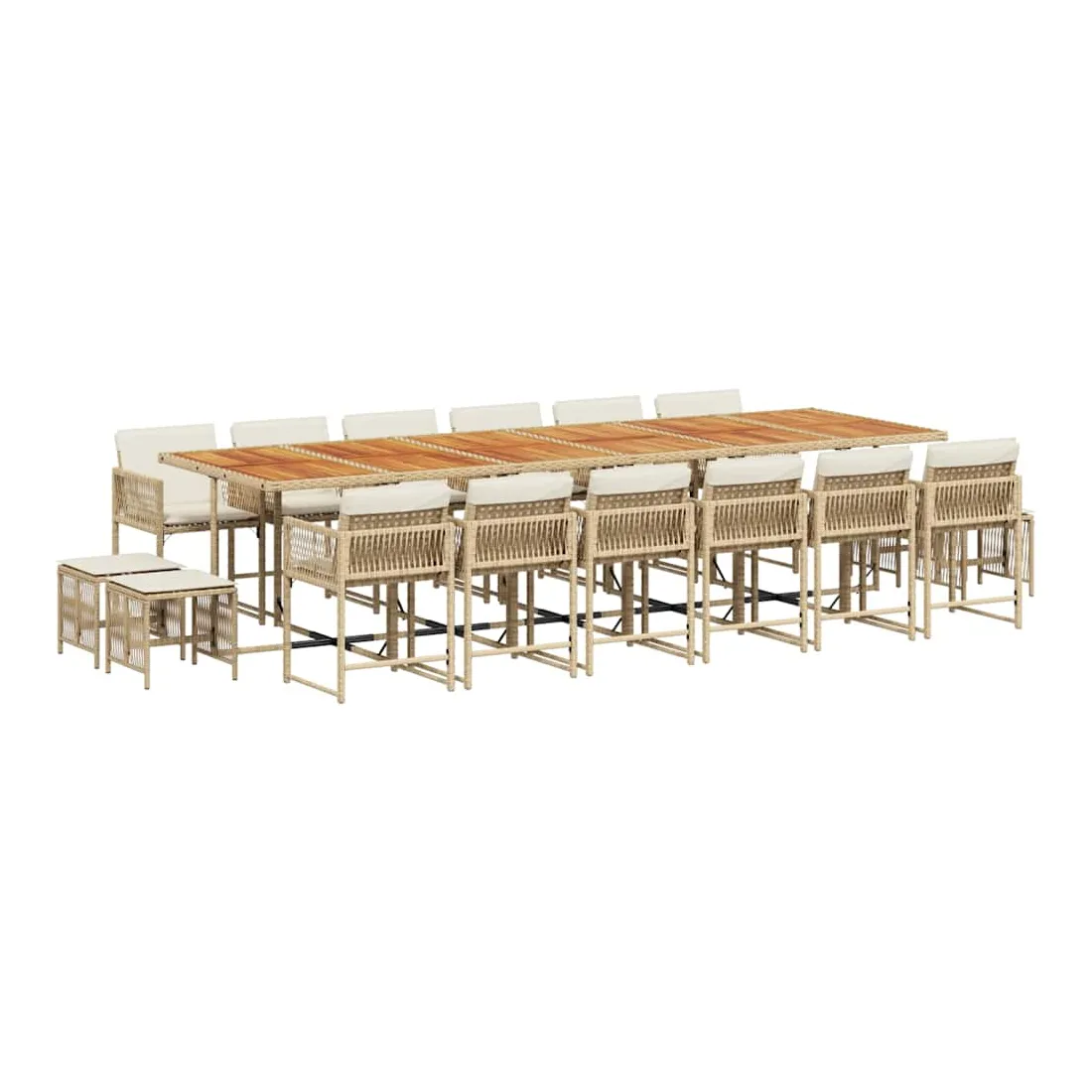 Cet ensemble de salle à manger de jardin est un excellent choix pour les repas en plein air ou pour vous détendre dans le jardin, dans l'arrière-cour ou sur la terrasse. Matériau durable : la résine tressée, également connue sous le nom de poly rotin, est un matériau synthétique solide et nécessitant peu d'entretien qui ressemble au rotin naturel. Il est léger, facile à nettoyer et couramment utilisé pour les meubles d'extérieur en raison de sa durabilité et de ses propriétés de résistance aux intempéries.Rangement compact : ces chaises sont dotées d'un dossier rabattable, ce qui permet de les ranger facilement sous la table. Une fois pliées, elles se rangent parfaitement sous la table, formant un cube peu encombrant. De plus, les tabourets peuvent également être rangés sous les chaises, maximisant encore davantage l'efficacité de l'espace.Expérience d'assise confortable : ce mobilier d'extérieur, doté de coussins épais, offre une expérience d'assise confortable.Housse amovible et lavable : ces coussins de siège sont dotés de housses amovibles pour un lavage et un entretien faciles. Les housses de coussin ont un rabat à l'arrière pour une fixation facile aux dossiers.Dessus stable et facile à nettoyer : cette table de jardin a un dessus en bois d'acacia robuste, durable et facile à nettoyer avec un chiffon humide. Bon à savoir :Pour que vos meubles d'extérieur restent beaux, nous vous recommandons de les protéger avec une housse imperméable.