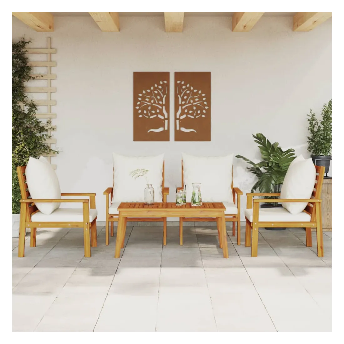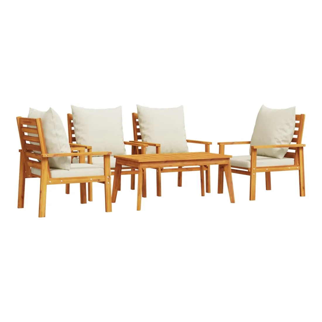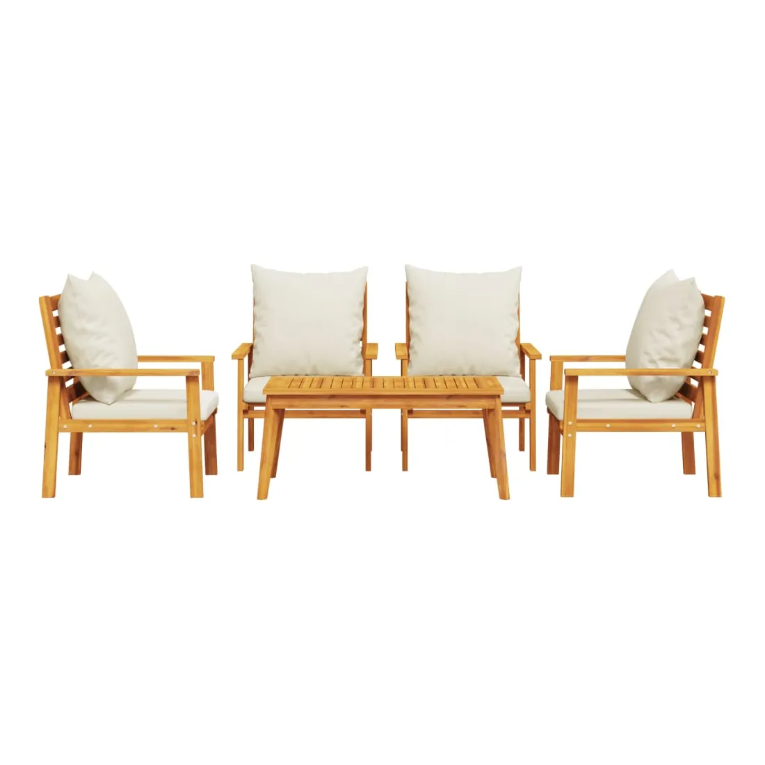 Cet ensemble de salon de jardin en bois a un design élégant et constitue un excellent choix pour vous détendre et profiter du jardin ou du patio. Bois d'acacia massif : l'ensemble de salon d'extérieur est fabriqué en bois d'acacia massif pour plus de robustesse et de stabilité. Le bois d'acacia solide est un beau matériau naturel. Le bois d'acacia a de beaux grains de bois qui rendent chaque meuble unique et légèrement différent les uns des autres.Expérience d'assise confortable : doté d'accoudoirs et d'un dossier, l'ensemble de salon de terrasse vous offre le plus grand confort. De plus, les coussins bien rembourrés offrent du confort pendant votre temps d'assise.Dessus stable et facile à nettoyer : cette table de jardin a un dessus en bois d'acacia robuste, durable et facile à nettoyer avec un chiffon humide.Nombreuses applications : le siège de jardin est parfait pour tout porche avant, patio, arrière-cour, pelouse, jardin, etc. Bon à savoir :Pour que vos meubles d'extérieur restent beaux, nous vous recommandons de les protéger avec une housse imperméable.