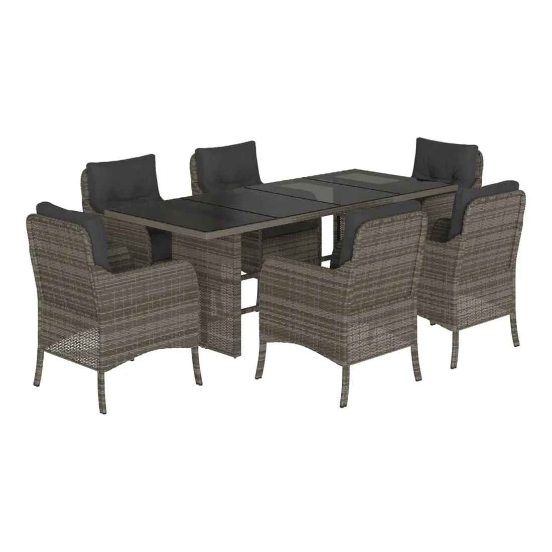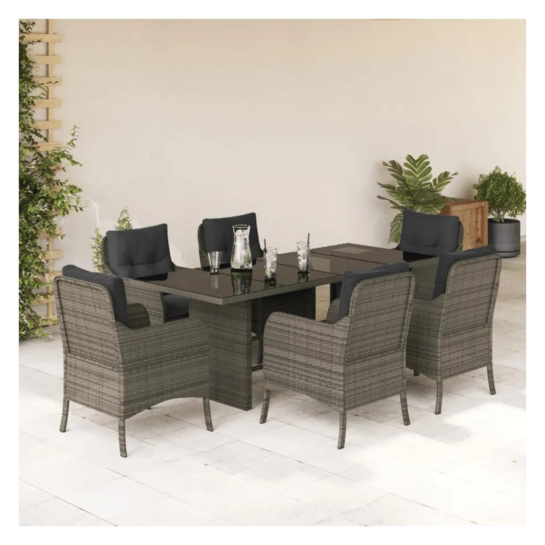 Cet ensemble de salle à manger de jardin est un excellent choix pour les repas en plein air ou pour vous détendre dans le jardin, dans l'arrière-cour ou sur la terrasse. Matériau durable : la résine tressée, également connue sous le nom de poly rotin, est un matériau synthétique solide et nécessitant peu d'entretien qui ressemble au rotin naturel. Il est léger, facile à nettoyer et couramment utilisé pour les meubles d'extérieur en raison de sa durabilité et de ses propriétés de résistance aux intempéries.Expérience d'assise confortable : ce mobilier d'extérieur, doté de coussins épais, offre une expérience d'assise confortable.Housse amovible et lavable : ces coussins de siège sont dotés de housses amovibles pour un lavage et un entretien faciles.Dessus en verre : le dessus de la table d'extérieur est fabriqué en verre trempé solide et durable, ce qui le rend facile à nettoyer avec un chiffon humide et ajoute une touche d'élégance à votre espace extérieur.Cadre robuste et stable : le cadre en acier enduit de poudre assure la solidité et la stabilité du meuble de jardin pour une utilisation quotidienne à l'extérieur. Bon à savoir :Pour que vos meubles d'extérieur restent beaux, nous vous recommandons de les protéger avec une housse imperméable.