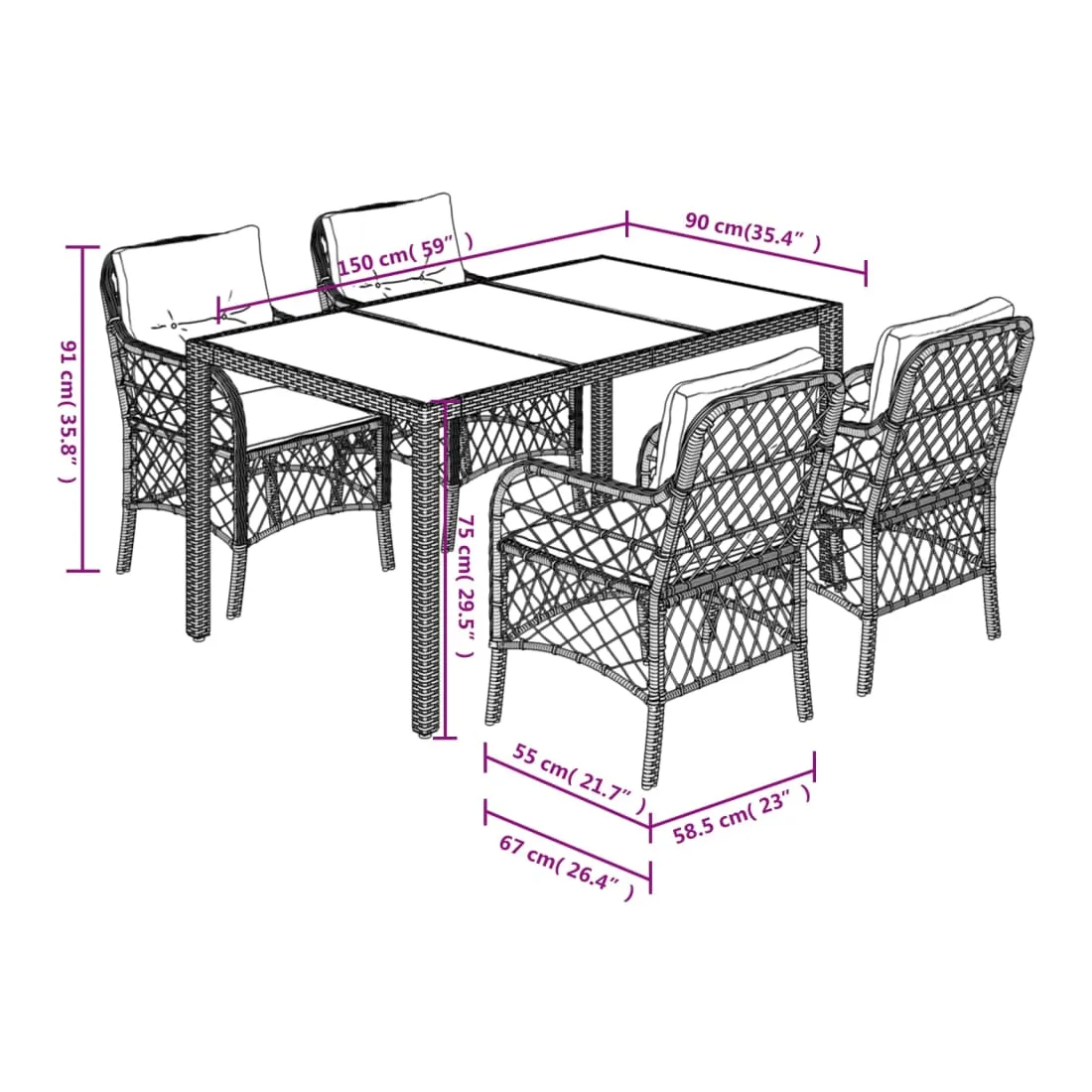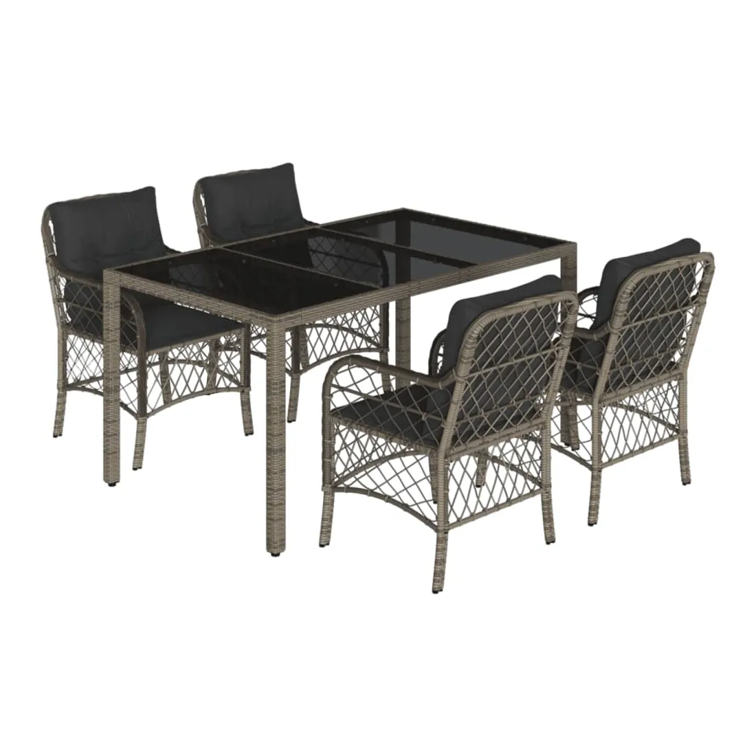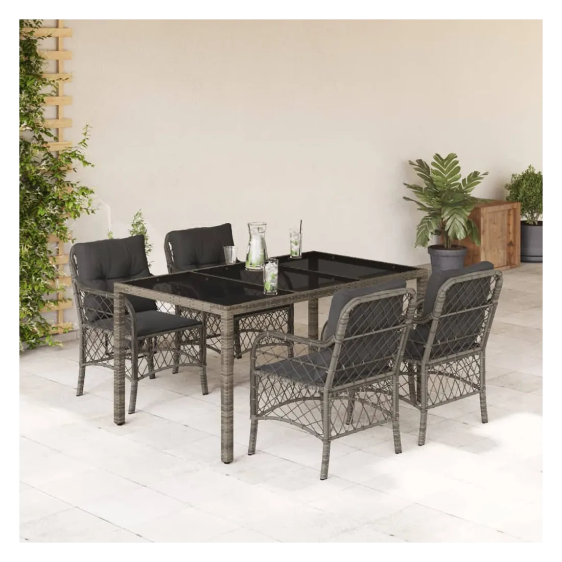 Cet ensemble de salle à manger de jardin est un excellent choix pour les repas en plein air ou pour vous détendre dans le jardin, l'arrière-cour ou le patio. Matériau durable : la résine tressée, également connue sous le nom de poly rotin, est un matériau synthétique solide et nécessitant peu d'entretien qui ressemble au rotin naturel. Il est léger, facile à nettoyer et couramment utilisé pour les meubles d'extérieur en raison de sa durabilité et de ses propriétés de résistance aux intempéries.Expérience d'assise confortable : ce mobilier d'extérieur, doté de coussins épais, offre une expérience d'assise confortable.Housse amovible et lavable : ces coussins de siège sont dotés de housses amovibles pour un lavage et un entretien faciles.Dessus en verre : le dessus de la table d'extérieur est fabriqué en verre trempé solide et durable, ce qui le rend facile à nettoyer avec un chiffon humide et ajoute une touche d'élégance à votre espace extérieur.Cadre robuste et stable : le cadre en acier enduit de poudre assure la solidité et la stabilité du meuble de jardin pour une utilisation quotidienne à l'extérieur. Bon à savoir :Pour que vos meubles d'extérieur restent beaux, nous vous recommandons de les protéger avec une housse imperméable.