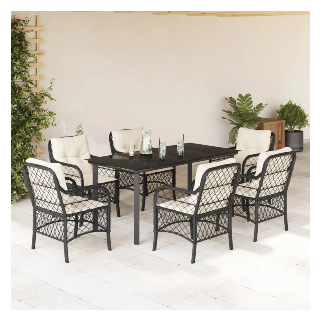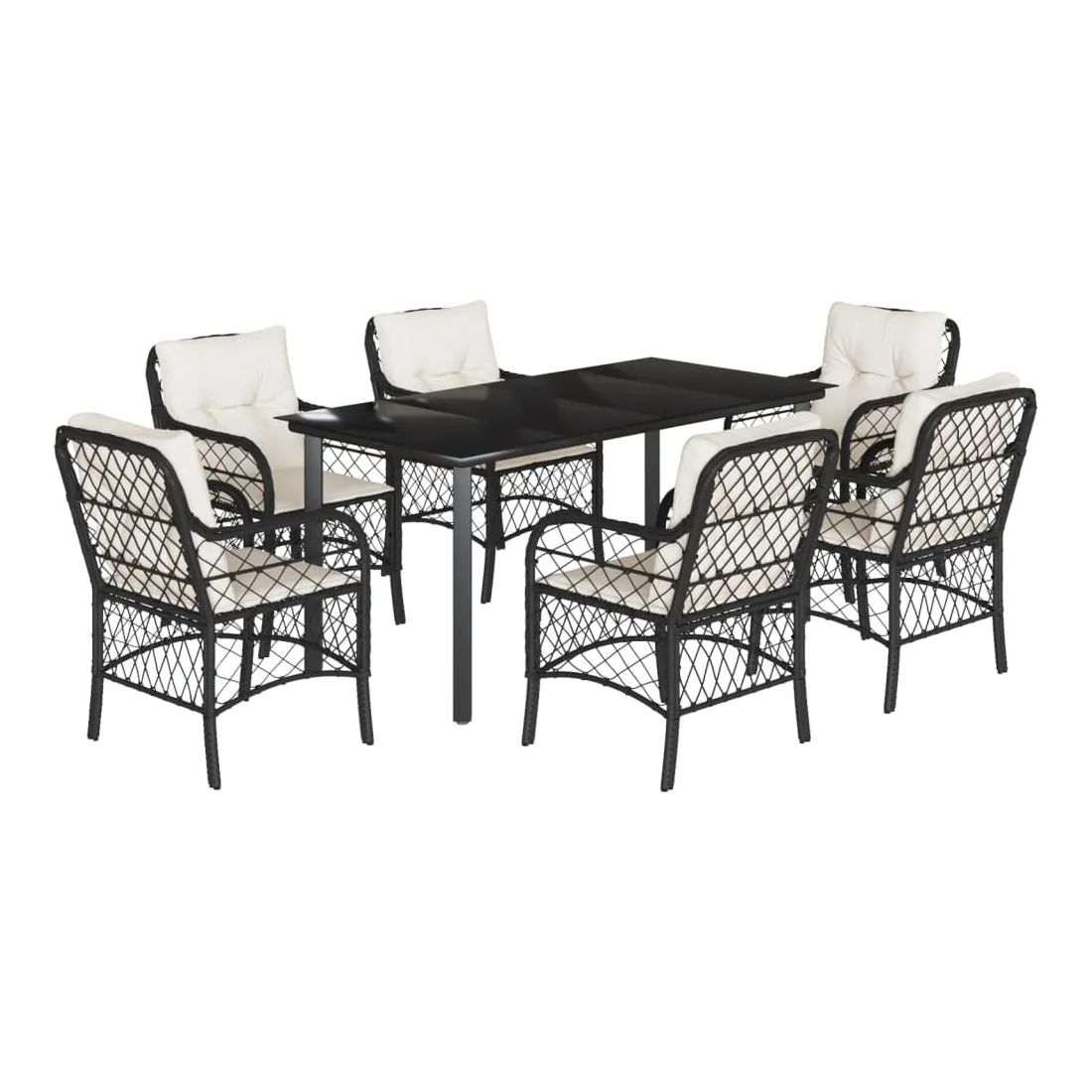 Cet ensemble de salle à manger de jardin est un excellent choix pour les repas en plein air ou pour vous détendre dans le jardin, l'arrière-cour ou le patio. Matériau durable : la résine tressée, également connue sous le nom de poly rotin, est un matériau synthétique solide et nécessitant peu d'entretien qui ressemble au rotin naturel. Il est léger, facile à nettoyer et couramment utilisé pour les meubles d'extérieur en raison de sa durabilité et de ses propriétés de résistance aux intempéries.Expérience d'assise confortable : ce mobilier d'extérieur, doté de coussins épais, offre une expérience d'assise confortable.Housse amovible et lavable : ces coussins de siège sont dotés de housses amovibles pour un lavage et un entretien faciles.Dessus en verre : le dessus de la table d'extérieur est fabriqué en verre trempé solide et durable, ce qui le rend facile à nettoyer avec un chiffon humide et ajoute une touche d'élégance à votre espace extérieur.Cadre robuste et stable : le cadre en acier enduit de poudre assure la solidité et la stabilité du meuble de jardin pour une utilisation quotidienne à l'extérieur. Bon à savoir :Pour que vos meubles d'extérieur restent beaux, nous vous recommandons de les protéger avec une housse imperméable.