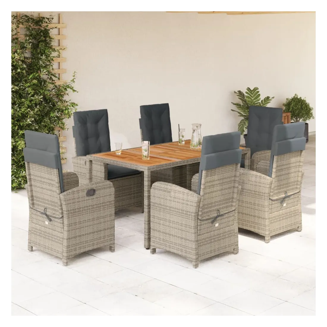 Cet ensemble de salle à manger de jardin est un excellent choix pour les repas en plein air ou pour vous détendre dans le jardin, dans l'arrière-cour ou sur la terrasse. Matériau durable : la résine tressée, également connue sous le nom de poly rotin, est un matériau synthétique solide et nécessitant peu d'entretien qui ressemble au rotin naturel. Il est léger, facile à nettoyer et couramment utilisé pour les meubles d'extérieur en raison de sa durabilité et de ses propriétés de résistance aux intempéries.Dossier réglable : ce siège de jardin est doté d'une poignée. Vous pouvez régler le dossier dans n'importe quelle position en tirant sur la poignée et le remettre rapidement dans sa position initiale.Expérience d'assise confortable : ce mobilier d'extérieur, doté de coussins épais, offre une expérience d'assise confortable.Housse amovible et lavable : ces coussins de siège sont dotés de housses amovibles pour un lavage et un entretien faciles. Les coussins de dossier ont un rabat à l'arrière pour une fixation facile aux dossiers.Dessus en verre : le dessus de la table d'extérieur est fabriqué en verre trempé solide et durable, ce qui le rend facile à nettoyer avec un chiffon humide et ajoute une touche d'élégance à votre espace extérieur. Bon à savoir :Pour que vos meubles d'extérieur restent beaux, nous vous recommandons de les protéger avec une housse imperméable.
