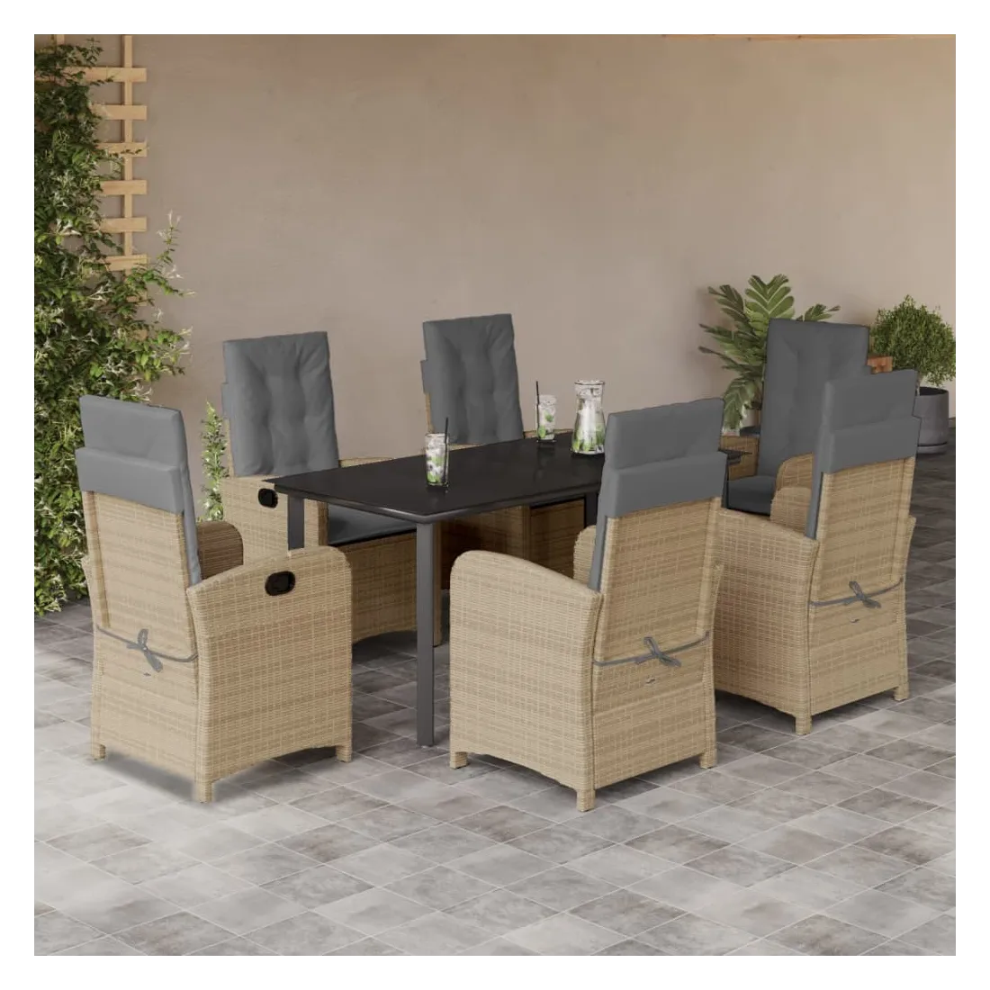 vidaXLCet ensemble de salle à manger de jardin est un excellent choix pour les repas en plein air ou pour vous détendre dans le jardin, dans l'arrière-cour ou sur la terrasse. Matériau durable : la résine tressée, également connue sous le nom de poly rotin, est un matériau synthétique solide et nécessitant peu d'entretien qui ressemble au rotin naturel. Il est léger, facile à nettoyer et couramment utilisé pour les meubles d'extérieur en raison de sa durabilité et de ses propriétés de résistance aux intempéries.Dossier réglable : ce siège de jardin est doté d'une poignée. Vous pouvez régler le dossier dans n'importe quelle position en tirant sur la poignée et le remettre rapidement dans sa position initiale.Expérience d'assise confortable : ce mobilier d'extérieur, doté de coussins épais, offre une expérience d'assise confortable.Housse amovible et lavable : ces coussins de siège sont dotés de housses amovibles pour un lavage et un entretien faciles. Les coussins de dossier ont un rabat à l'arrière pour une fixation facile aux dossiers.Dessus en verre : le dessus de la table d'extérieur est fabriqué en verre trempé solide et durable, ce qui le rend facile à nettoyer avec un chiffon humide et ajoute une touche d'élégance à votre espace extérieur. Bon à savoir :Pour que vos meubles d'extérieur restent beaux, nous vous recommandons de les protéger avec une housse imperméable.