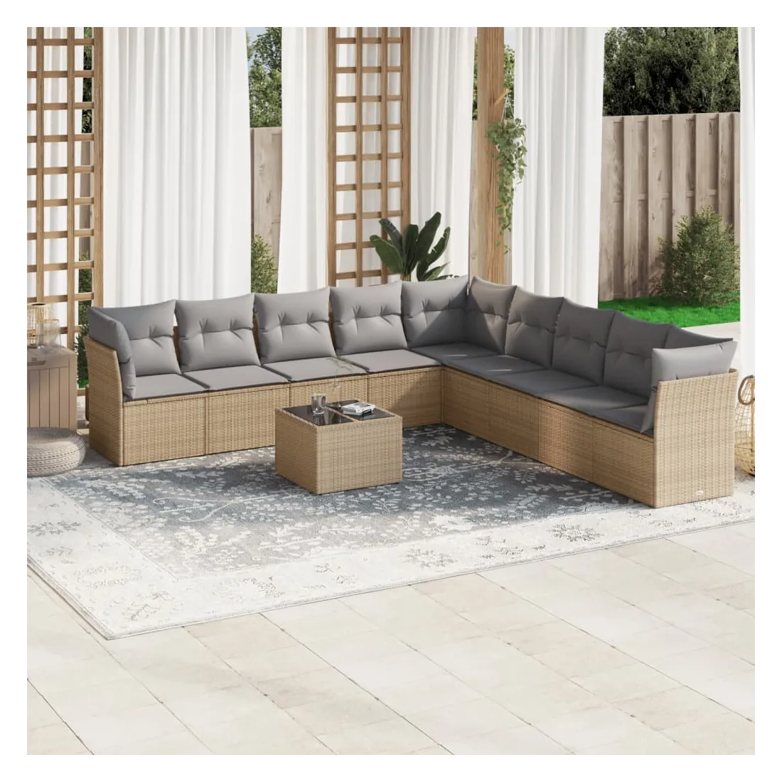Cet ensemble de canapés de jardin est le complément parfait de votre arrière-cour, terrasse ou patio, offrant un espace confortable et accueillant pour discuter avec la famille et les amis ou simplement se détendre et profiter de l'extérieur. Matériau durable : la résine tressée, également connue sous le nom de poly rotin, est un matériau synthétique solide et nécessitant peu d'entretien qui ressemble au rotin naturel. Il est léger, facile à nettoyer et couramment utilisé pour les meubles d'extérieur en raison de sa durabilité et de ses propriétés de résistance aux intempéries.Expérience d'assise confortable : ce mobilier d'extérieur, doté de coussins épais, offre une expérience d'assise confortable.Dessus en verre : le dessus de la table d'extérieur est fabriqué en verre trempé solide et durable, ce qui le rend facile à nettoyer avec un chiffon humide et ajoute une touche d'élégance à votre espace extérieur.Housse amovible et lavable : ces coussins de siège sont dotés de housses amovibles pour un lavage et un entretien faciles.Conception modulaire : cet ensemble de meubles d'extérieur a une conception modulaire, ce qui le rend complètement flexible et facile à déplacer, afin que vous puissiez créer un agencement de meubles d'extérieur personnalisé. Bon à savoir :Pour que vos meubles d'extérieur restent beaux, nous vous recommandons de les protéger avec une housse imperméable.