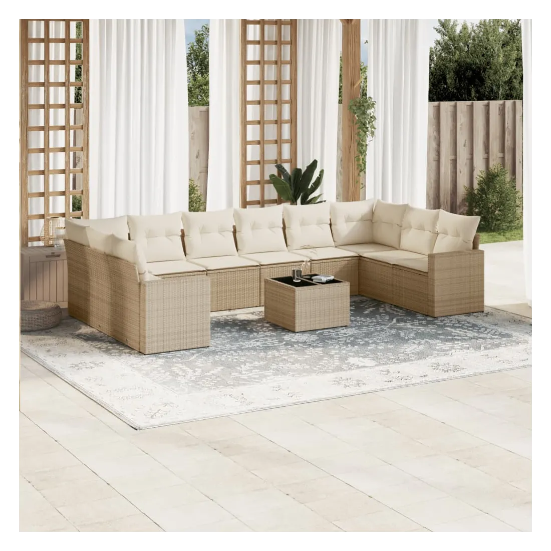 Cet ensemble de canapés de jardin est le complément parfait de votre arrière-cour, terrasse ou patio, offrant un espace confortable et accueillant pour discuter avec la famille et les amis ou simplement se détendre et profiter de l'extérieur. Matériau durable : la résine tressée, également connue sous le nom de poly rotin, est un matériau synthétique solide et nécessitant peu d'entretien qui ressemble au rotin naturel. Il est léger, facile à nettoyer et couramment utilisé pour les meubles d'extérieur en raison de sa durabilité et de ses propriétés de résistance aux intempéries.Expérience d'assise confortable : ce mobilier d'extérieur, doté de coussins épais, offre une expérience d'assise confortable.Housse amovible et lavable : ces coussins de siège sont dotés de housses amovibles pour un lavage et un entretien faciles.Dessus en verre : le dessus de la table d'extérieur est fabriqué en verre trempé solide et durable, ce qui le rend facile à nettoyer avec un chiffon humide et ajoute une touche d'élégance à votre espace extérieur.Conception modulaire : cet ensemble de meubles d'extérieur a une conception modulaire, ce qui le rend complètement flexible et facile à déplacer, afin que vous puissiez créer un agencement de meubles d'extérieur personnalisé. Bon à savoir :Pour que vos meubles d'extérieur restent beaux, nous vous recommandons de les protéger avec une housse imperméable.