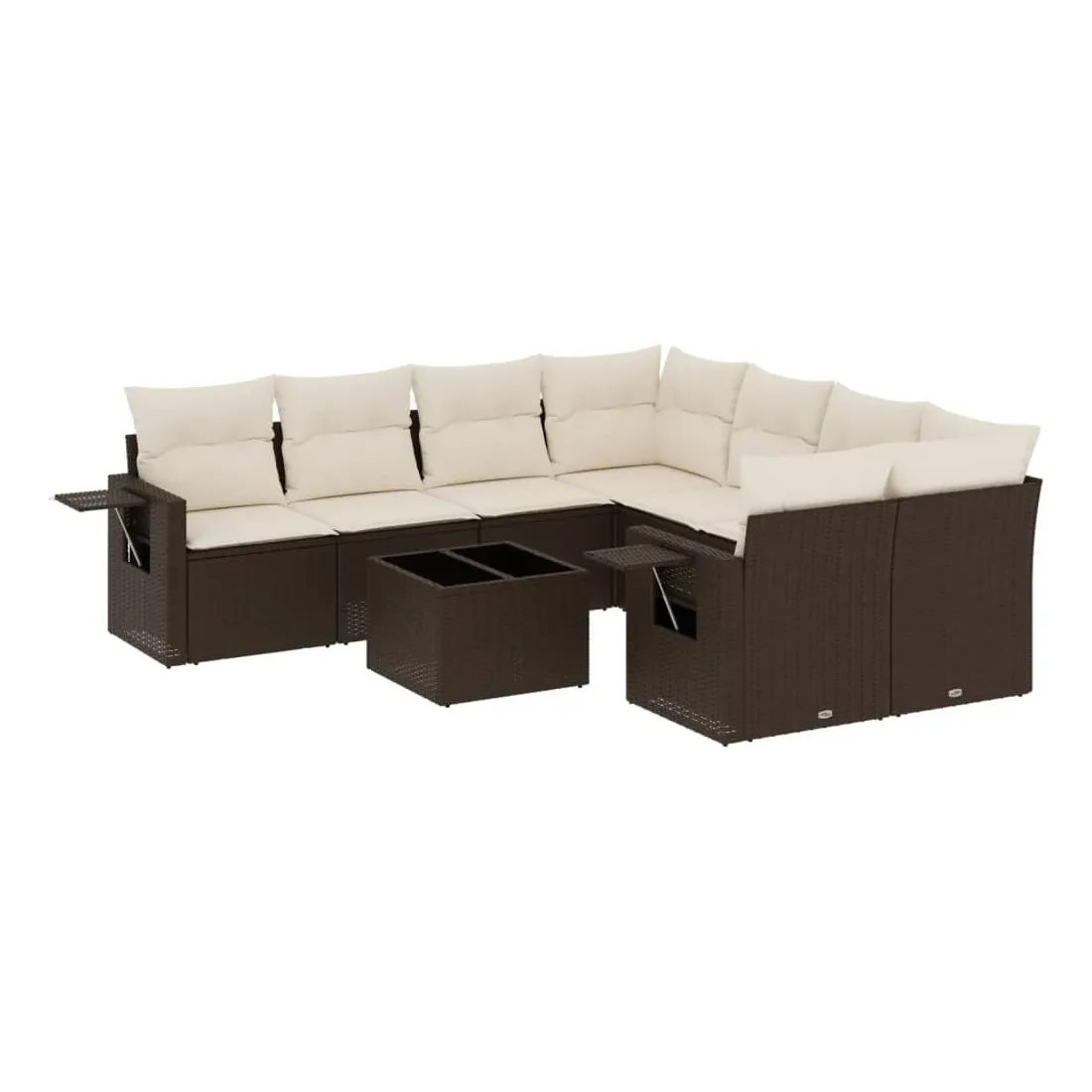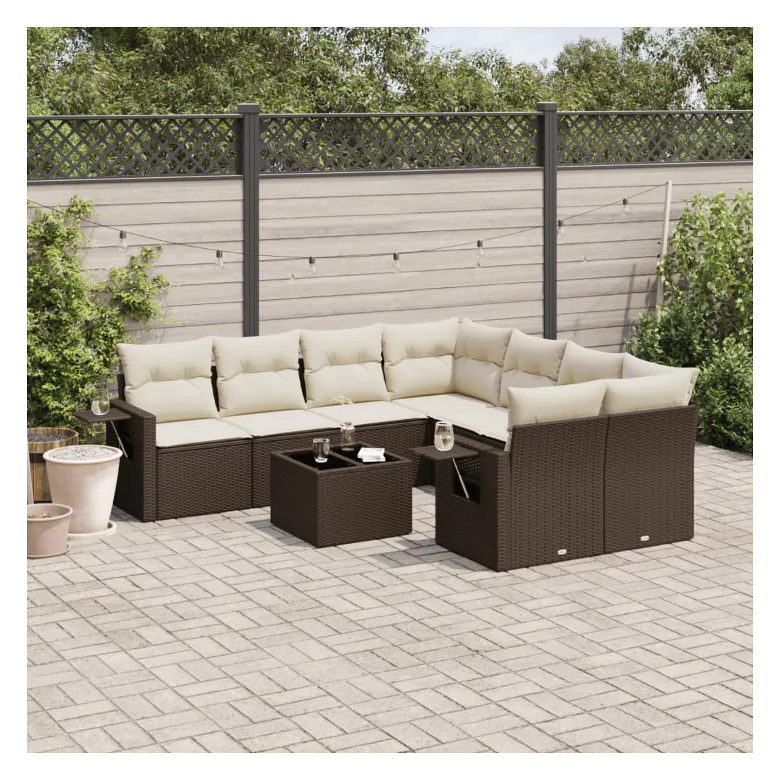 Cet ensemble de canapés de jardin est le complément parfait de votre arrière-cour, terrasse ou patio, offrant un espace confortable et accueillant pour discuter avec la famille et les amis ou simplement se détendre et profiter de l'extérieur. Matériau durable : la résine tressée, également connue sous le nom de poly rotin, est un matériau synthétique solide et nécessitant peu d'entretien qui ressemble au rotin naturel. Il est léger, facile à nettoyer et couramment utilisé pour les meubles d'extérieur en raison de sa durabilité et de ses propriétés de résistance aux intempéries.Dessus en verre : le dessus de la table d'extérieur est fabriqué en verre trempé solide et durable, ce qui le rend facile à nettoyer avec un chiffon humide et ajoute une touche d'élégance à votre espace extérieur. Table d'appoint pratique : ce mobilier d'extérieur comprend des tables d'appoint pliables avec un ressort à gaz sur les accoudoirs, offrant des endroits pratiques pour garder vos essentiels à portée de main. Expérience d'assise confortable : ce mobilier d'extérieur, doté de coussins épais, offre une expérience d'assise confortable.Conception modulaire : cet ensemble de meubles d'extérieur a une conception modulaire, ce qui le rend complètement flexible et facile à déplacer, afin que vous puissiez créer un agencement de meubles d'extérieur personnalisé. Bon à savoir :Pour que vos meubles d'extérieur restent beaux, nous vous recommandons de les protéger avec une housse imperméable.