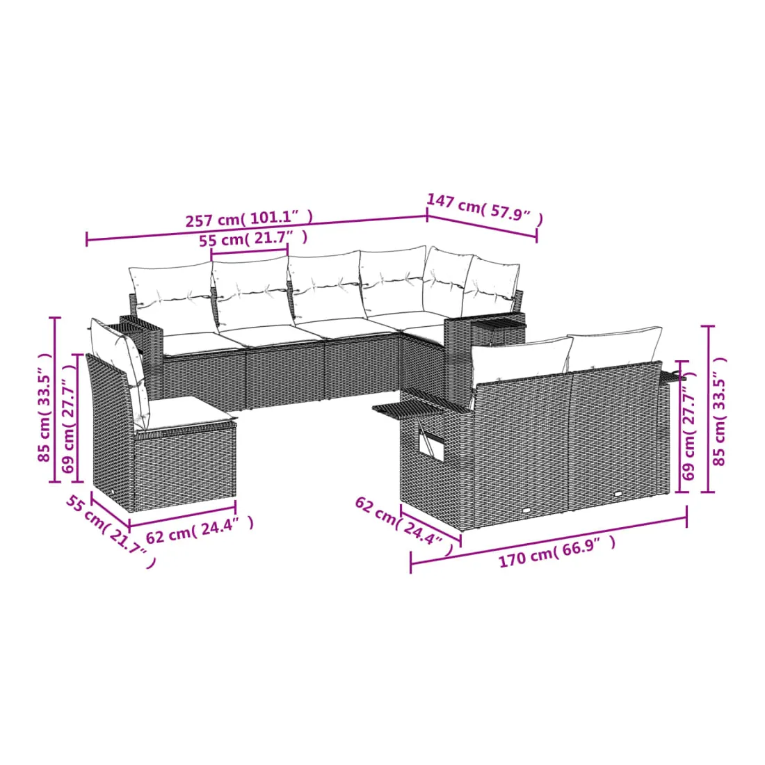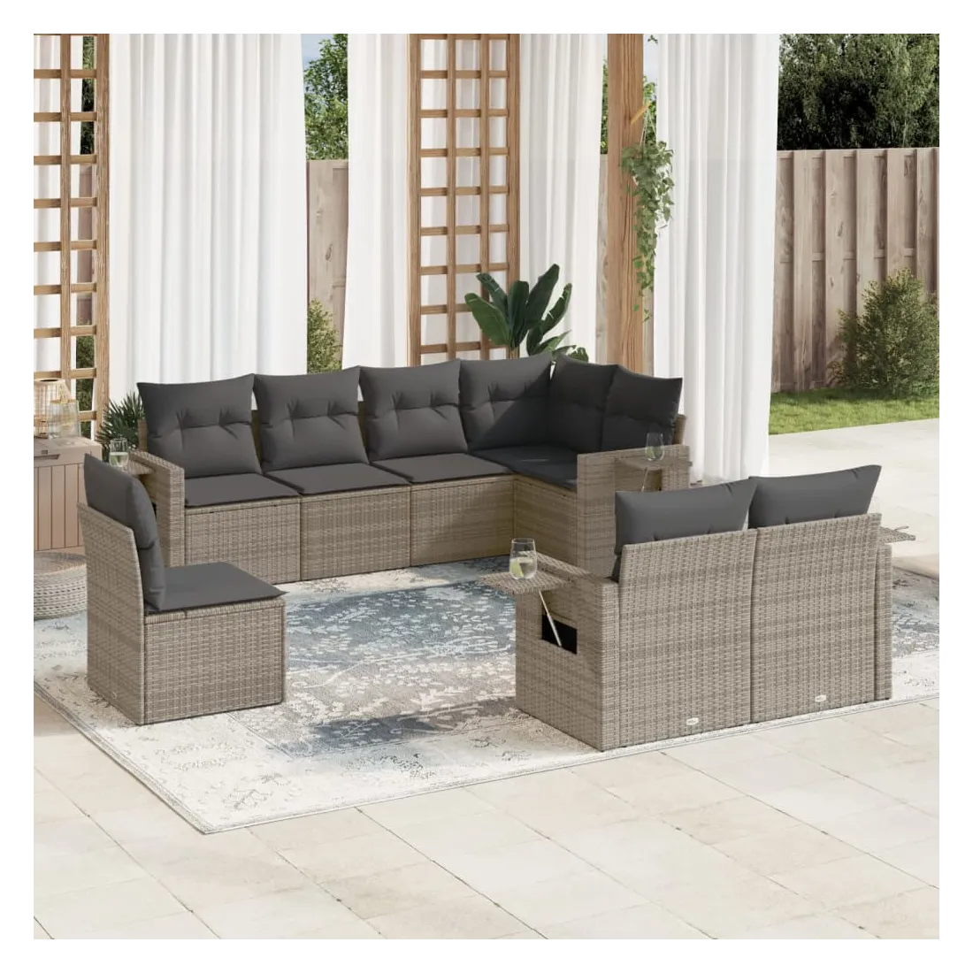 Cet ensemble de canapés de jardin est le complément parfait de votre arrière-cour, terrasse ou patio, offrant un espace confortable et accueillant pour discuter avec la famille et les amis ou simplement se détendre et profiter de l'extérieur. Matériau durable : la résine tressée, également connue sous le nom de poly rotin, est un matériau synthétique solide et nécessitant peu d'entretien qui ressemble au rotin naturel. Il est léger, facile à nettoyer et couramment utilisé pour les meubles d'extérieur en raison de sa durabilité et de ses propriétés de résistance aux intempéries. Table d'appoint pratique : ce mobilier d'extérieur comprend des tables d'appoint pliables avec un ressort à gaz sur les accoudoirs, offrant des endroits pratiques pour garder vos essentiels à portée de main. Expérience d'assise confortable : ce mobilier d'extérieur, doté de coussins épais, offre une expérience d'assise confortable. Housse amovible et lavable : ces coussins de siège sont dotés de housses amovibles pour un lavage et un entretien faciles.Conception modulaire : cet ensemble de meubles d'extérieur a une conception modulaire, ce qui le rend complètement flexible et facile à déplacer, afin que vous puissiez créer un agencement de meubles d'extérieur personnalisé. Bon à savoir :Pour que vos meubles d'extérieur restent beaux, nous vous recommandons de les protéger avec une housse imperméable.