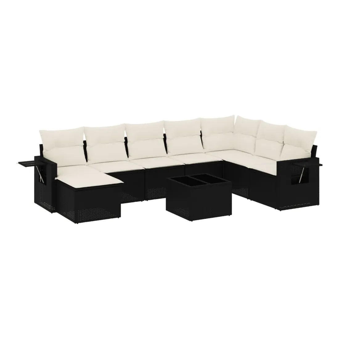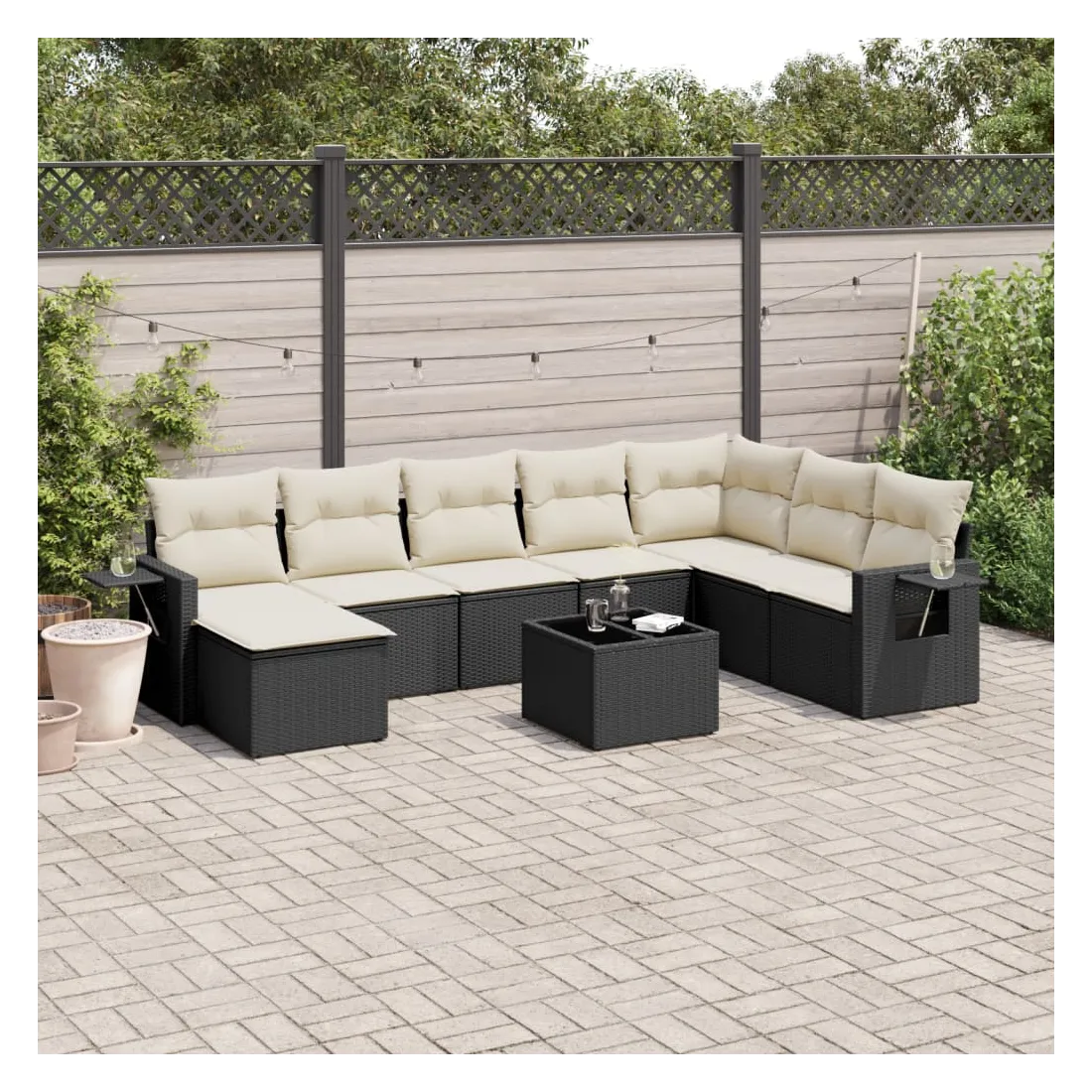 Cet ensemble de canapés de jardin est le complément parfait de votre arrière-cour, terrasse ou patio, offrant un espace confortable et accueillant pour discuter avec la famille et les amis ou simplement se détendre et profiter de l'extérieur. Matériau durable : la résine tressée, également connue sous le nom de poly rotin, est un matériau synthétique solide et nécessitant peu d'entretien qui ressemble au rotin naturel. Il est léger, facile à nettoyer et couramment utilisé pour les meubles d'extérieur en raison de sa durabilité et de ses propriétés de résistance aux intempéries.Dessus en verre : le dessus de la table d'extérieur est fabriqué en verre trempé solide et durable, ce qui le rend facile à nettoyer avec un chiffon humide et ajoute une touche d'élégance à votre espace extérieur. Table d'appoint pratique : ce mobilier d'extérieur comprend des tables d'appoint pliables avec un ressort à gaz sur les accoudoirs, offrant des endroits pratiques pour garder vos essentiels à portée de main. Expérience d'assise confortable : ce mobilier d'extérieur, doté de coussins épais, offre une expérience d'assise confortable.Conception modulaire : cet ensemble de meubles d'extérieur a une conception modulaire, ce qui le rend complètement flexible et facile à déplacer, afin que vous puissiez créer un agencement de meubles d'extérieur personnalisé. Bon à savoir :Pour que vos meubles d'extérieur restent beaux, nous vous recommandons de les protéger avec une housse imperméable.
