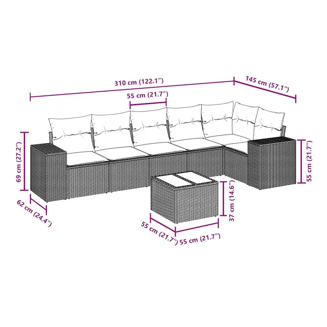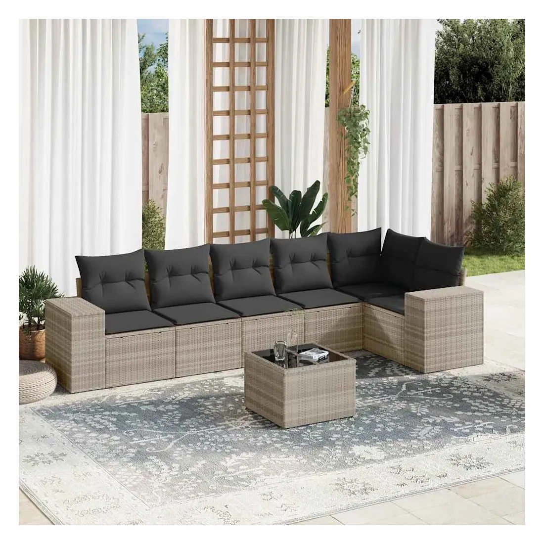 Cet ensemble de canapés de jardin est le complément parfait de votre arrière-cour, terrasse ou patio, offrant un espace confortable et accueillant pour discuter avec la famille et les amis ou simplement se détendre et profiter de l'extérieur. Matériau durable : la résine tressée, également connue sous le nom de poly rotin, est un matériau synthétique solide et nécessitant peu d'entretien qui ressemble au rotin naturel. Il est léger, facile à nettoyer et couramment utilisé pour les meubles d'extérieur en raison de sa durabilité et de ses propriétés de résistance aux intempéries.Expérience d'assise confortable : ce mobilier d'extérieur, doté de coussins épais, offre une expérience d'assise confortable.Dessus en verre : le dessus de la table d'extérieur est fabriqué en verre trempé solide et durable, ce qui le rend facile à nettoyer avec un chiffon humide et ajoute une touche d'élégance à votre espace extérieur.Housse amovible et lavable : ces coussins de siège sont dotés de housses amovibles pour un lavage et un entretien faciles.Conception modulaire : cet ensemble de meubles d'extérieur a une conception modulaire, ce qui le rend complètement flexible et facile à déplacer, afin que vous puissiez créer un agencement de meubles d'extérieur personnalisé. Bon à savoir :Pour que vos meubles d'extérieur restent beaux, nous vous recommandons de les protéger avec une housse imperméable.