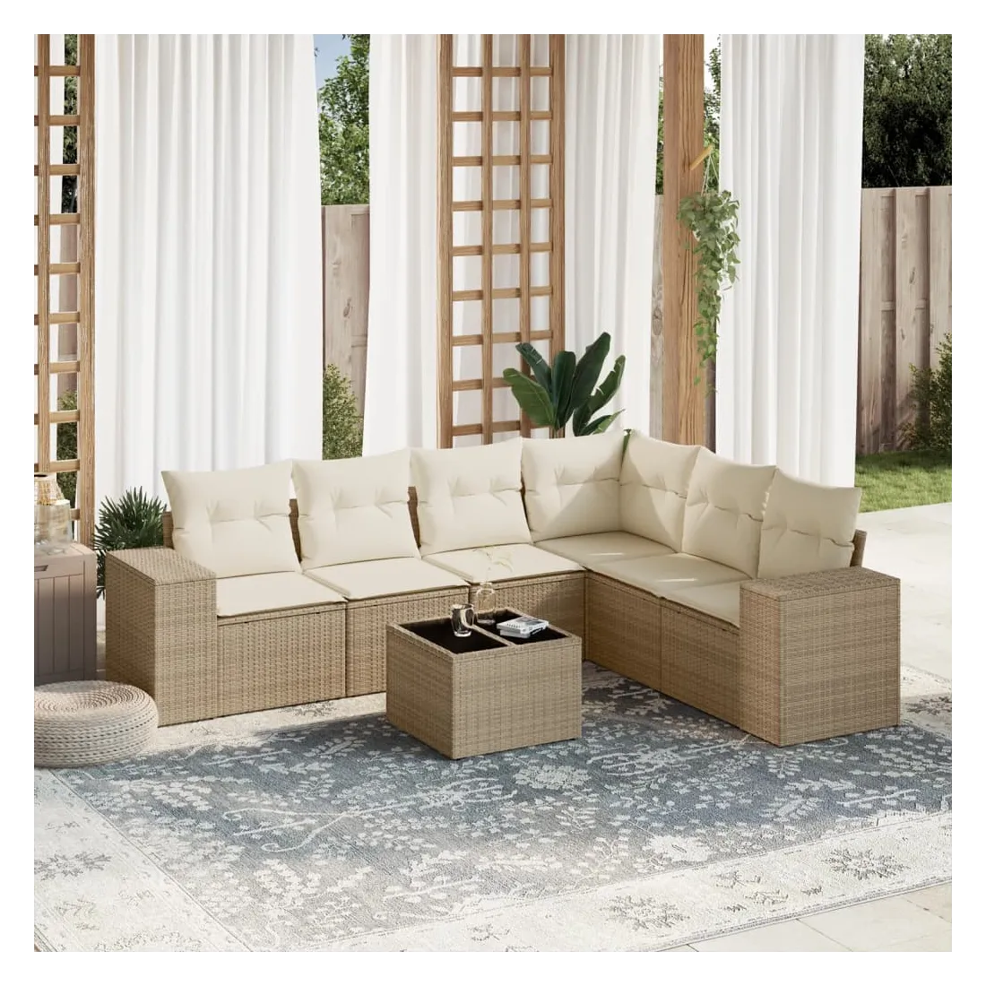 Cet ensemble de canapés de jardin est le complément parfait de votre arrière-cour, terrasse ou patio, offrant un espace confortable et accueillant pour discuter avec la famille et les amis ou simplement se détendre et profiter de l'extérieur. Matériau durable : la résine tressée, également connue sous le nom de poly rotin, est un matériau synthétique solide et nécessitant peu d'entretien qui ressemble au rotin naturel. Il est léger, facile à nettoyer et couramment utilisé pour les meubles d'extérieur en raison de sa durabilité et de ses propriétés de résistance aux intempéries.Expérience d'assise confortable : ce mobilier d'extérieur, doté de coussins épais, offre une expérience d'assise confortable.Dessus en verre : le dessus de la table d'extérieur est fabriqué en verre trempé solide et durable, ce qui le rend facile à nettoyer avec un chiffon humide et ajoute une touche d'élégance à votre espace extérieur.Housse amovible et lavable : ces coussins de siège sont dotés de housses amovibles pour un lavage et un entretien faciles.Conception modulaire : cet ensemble de meubles d'extérieur a une conception modulaire, ce qui le rend complètement flexible et facile à déplacer, afin que vous puissiez créer un agencement de meubles d'extérieur personnalisé. Bon à savoir :Pour que vos meubles d'extérieur restent beaux, nous vous recommandons de les protéger avec une housse imperméable.