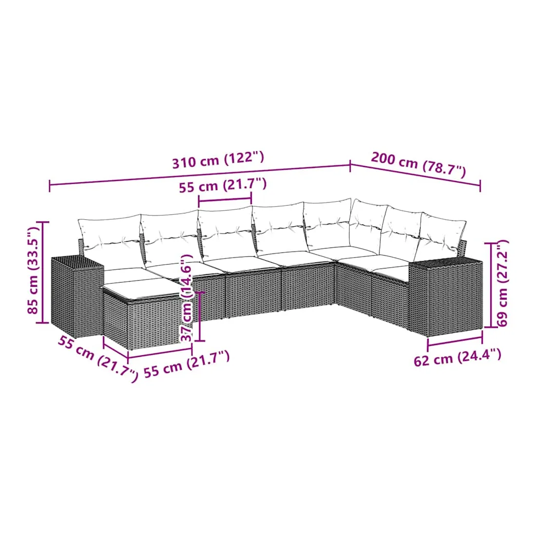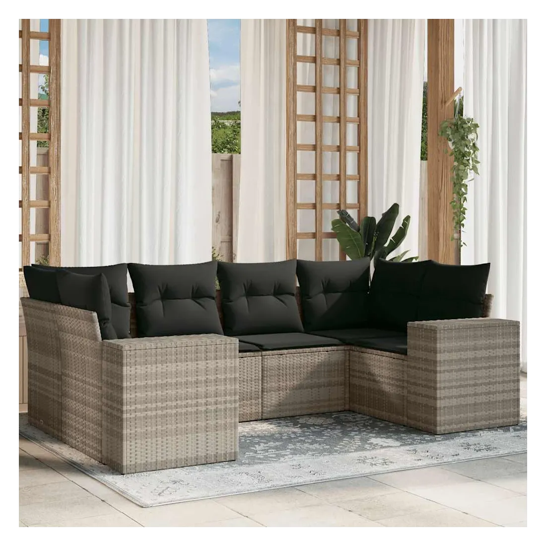 Cet ensemble de canapés de jardin est le complément parfait de votre arrière-cour, terrasse ou patio, offrant un espace confortable et accueillant pour discuter avec la famille et les amis ou simplement se détendre et profiter de l'extérieur. Matériau durable : la résine tressée, également connue sous le nom de poly rotin, est un matériau synthétique solide et nécessitant peu d'entretien qui ressemble au rotin naturel. Il est léger, facile à nettoyer et couramment utilisé pour les meubles d'extérieur en raison de sa durabilité et de ses propriétés de résistance aux intempéries.Expérience d'assise confortable : ce mobilier d'extérieur, doté de coussins épais, offre une expérience d'assise confortable.Housse amovible et lavable : ces coussins de siège sont dotés de housses amovibles pour un lavage et un entretien faciles.Conception modulaire : cet ensemble de meubles d'extérieur a une conception modulaire, ce qui le rend complètement flexible et facile à déplacer, afin que vous puissiez créer un agencement de meubles d'extérieur personnalisé. Bon à savoir :Pour que vos meubles d'extérieur restent beaux, nous vous recommandons de les protéger avec une housse imperméable.