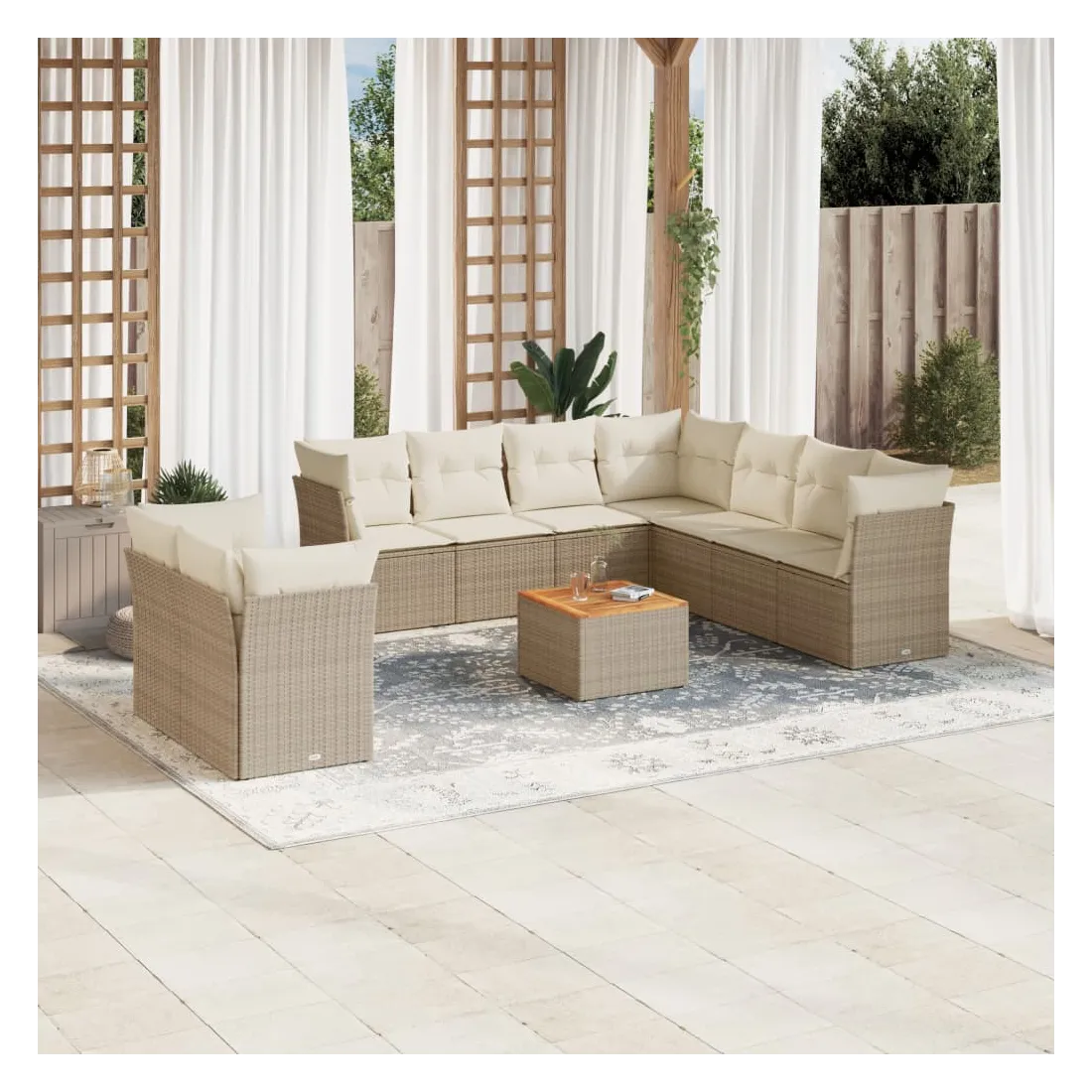 Cet ensemble de canapés de jardin est le complément parfait de votre arrière-cour, terrasse ou patio, offrant un espace confortable et accueillant pour discuter avec la famille et les amis ou simplement se détendre et profiter de l'extérieur. Matériau durable : la résine tressée, également connue sous le nom de poly rotin, est un matériau synthétique solide et nécessitant peu d'entretien qui ressemble au rotin naturel. Il est léger, facile à nettoyer et couramment utilisé pour les meubles d'extérieur en raison de sa durabilité et de ses propriétés de résistance aux intempéries.Expérience d'assise confortable : ce mobilier d'extérieur, doté de coussins épais, offre une expérience d'assise confortable.Dessus stable et facile à nettoyer : cette table de jardin a un dessus en bois d'acacia robuste, durable et facile à nettoyer avec un chiffon humide.Housse amovible et lavable : ces coussins de siège sont dotés de housses amovibles pour un lavage et un entretien faciles.Conception modulaire : cet ensemble de meubles d'extérieur a une conception modulaire, ce qui le rend complètement flexible et facile à déplacer, afin que vous puissiez créer un agencement de meubles d'extérieur personnalisé. Bon à savoir :Pour que vos meubles d'extérieur restent beaux, nous vous recommandons de les protéger avec une housse imperméable.