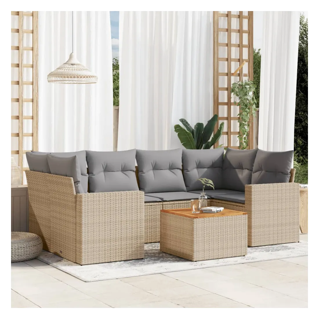 Cet ensemble de canapés de jardin est le complément parfait de votre arrière-cour, terrasse ou patio, offrant un espace confortable et accueillant pour discuter avec la famille et les amis ou simplement se détendre et profiter de l'extérieur. Matériau durable : la résine tressée, également connue sous le nom de poly rotin, est un matériau synthétique solide et nécessitant peu d'entretien qui ressemble au rotin naturel. Il est léger, facile à nettoyer et couramment utilisé pour les meubles d'extérieur en raison de sa durabilité et de ses propriétés de résistance aux intempéries.Expérience d'assise confortable : ce mobilier d'extérieur, doté de coussins épais, offre une expérience d'assise confortable.Dessus stable et facile à nettoyer : cette table de jardin a un dessus en bois d'acacia robuste, durable et facile à nettoyer avec un chiffon humide.Housse amovible et lavable : ces coussins de siège sont dotés de housses amovibles pour un lavage et un entretien faciles.Conception modulaire : cet ensemble de meubles d'extérieur a une conception modulaire, ce qui le rend complètement flexible et facile à déplacer, afin que vous puissiez créer un agencement de meubles d'extérieur personnalisé. Bon à savoir :Pour que vos meubles d'extérieur restent beaux, nous vous recommandons de les protéger avec une housse imperméable.