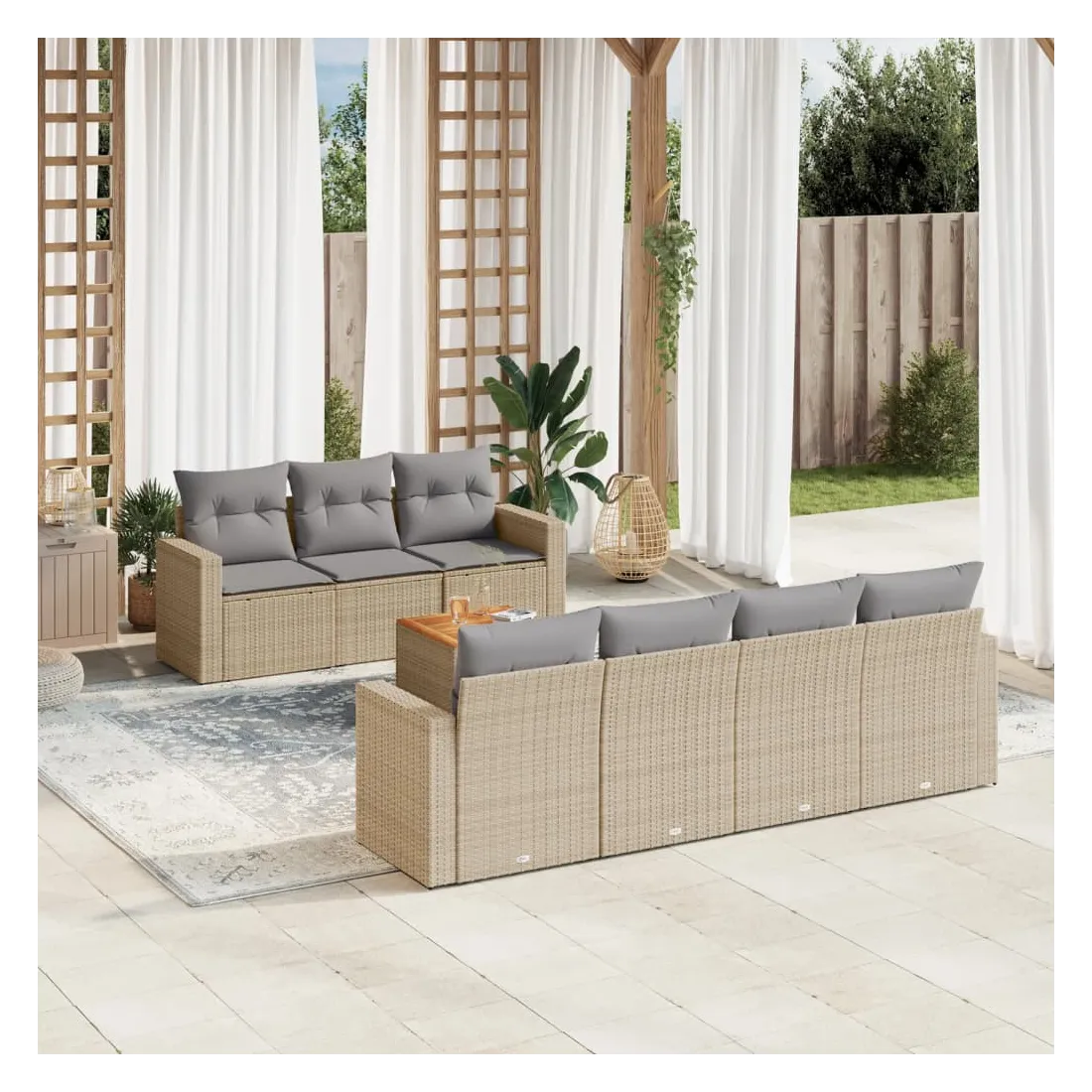 Cet ensemble de canapés de jardin est le complément parfait de votre arrière-cour, terrasse ou patio, offrant un espace confortable et accueillant pour discuter avec la famille et les amis ou simplement se détendre et profiter de l'extérieur. Matériau durable : la résine tressée, également connue sous le nom de poly rotin, est un matériau synthétique solide et nécessitant peu d'entretien qui ressemble au rotin naturel. Il est léger, facile à nettoyer et couramment utilisé pour les meubles d'extérieur en raison de sa durabilité et de ses propriétés de résistance aux intempéries.Expérience d'assise confortable : ce mobilier d'extérieur, doté de coussins épais, offre une expérience d'assise confortable.Dessus stable et facile à nettoyer : cette table de jardin a un dessus en bois d'acacia robuste, durable et facile à nettoyer avec un chiffon humide.Housse amovible et lavable : ces coussins de siège sont dotés de housses amovibles pour un lavage et un entretien faciles.Conception modulaire : cet ensemble de meubles d'extérieur a une conception modulaire, ce qui le rend complètement flexible et facile à déplacer, afin que vous puissiez créer un agencement de meubles d'extérieur personnalisé. Bon à savoir :Pour que vos meubles d'extérieur restent beaux, nous vous recommandons de les protéger avec une housse imperméable.