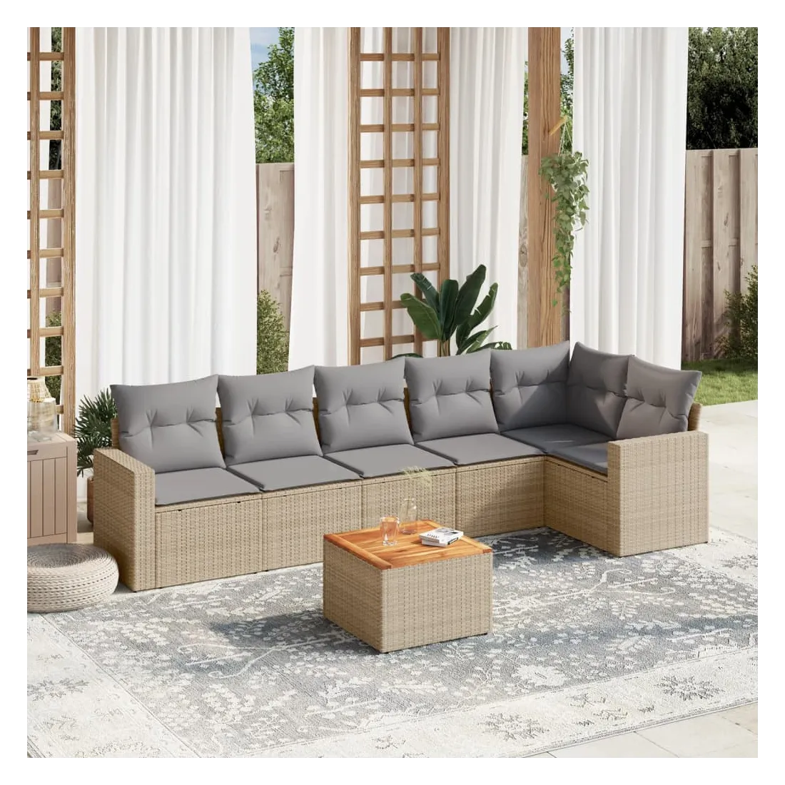 Cet ensemble de canapés de jardin est le complément parfait de votre arrière-cour, terrasse ou patio, offrant un espace confortable et accueillant pour discuter avec la famille et les amis ou simplement se détendre et profiter de l'extérieur. Matériau durable : la résine tressée, également connue sous le nom de poly rotin, est un matériau synthétique solide et nécessitant peu d'entretien qui ressemble au rotin naturel. Il est léger, facile à nettoyer et couramment utilisé pour les meubles d'extérieur en raison de sa durabilité et de ses propriétés de résistance aux intempéries.Expérience d'assise confortable : ce mobilier d'extérieur, doté de coussins épais, offre une expérience d'assise confortable.Dessus stable et facile à nettoyer : cette table de jardin a un dessus en bois d'acacia robuste, durable et facile à nettoyer avec un chiffon humide.Housse amovible et lavable : ces coussins de siège sont dotés de housses amovibles pour un lavage et un entretien faciles.Conception modulaire : cet ensemble de meubles d'extérieur a une conception modulaire, ce qui le rend complètement flexible et facile à déplacer, afin que vous puissiez créer un agencement de meubles d'extérieur personnalisé. Bon à savoir :Pour que vos meubles d'extérieur restent beaux, nous vous recommandons de les protéger avec une housse imperméable.