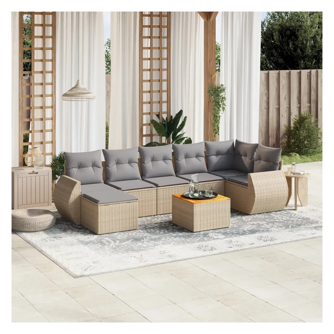 Cet ensemble de canapés de jardin est le complément parfait de votre arrière-cour, terrasse ou patio, offrant un espace confortable et accueillant pour discuter avec la famille et les amis ou simplement se détendre et profiter de l'extérieur. Matériau durable : la résine tressée, également connue sous le nom de poly rotin, est un matériau synthétique solide et nécessitant peu d'entretien qui ressemble au rotin naturel. Il est léger, facile à nettoyer et couramment utilisé pour les meubles d'extérieur en raison de sa durabilité et de ses propriétés de résistance aux intempéries.Dessus stable et facile à nettoyer : cette table de jardin a un dessus en bois d'acacia robuste, durable et facile à nettoyer avec un chiffon humide. Expérience d'assise confortable : ce mobilier d'extérieur, doté de coussins épais, offre une expérience d'assise confortable.Housse amovible et lavable : ces coussins de siège sont dotés de housses amovibles pour un lavage et un entretien faciles.Conception modulaire : cet ensemble de meubles d'extérieur a une conception modulaire, ce qui le rend complètement flexible et facile à déplacer, afin que vous puissiez créer un agencement de meubles d'extérieur personnalisé. Bon à savoir :Pour que vos meubles d'extérieur restent beaux, nous vous recommandons de les protéger avec une housse imperméable.