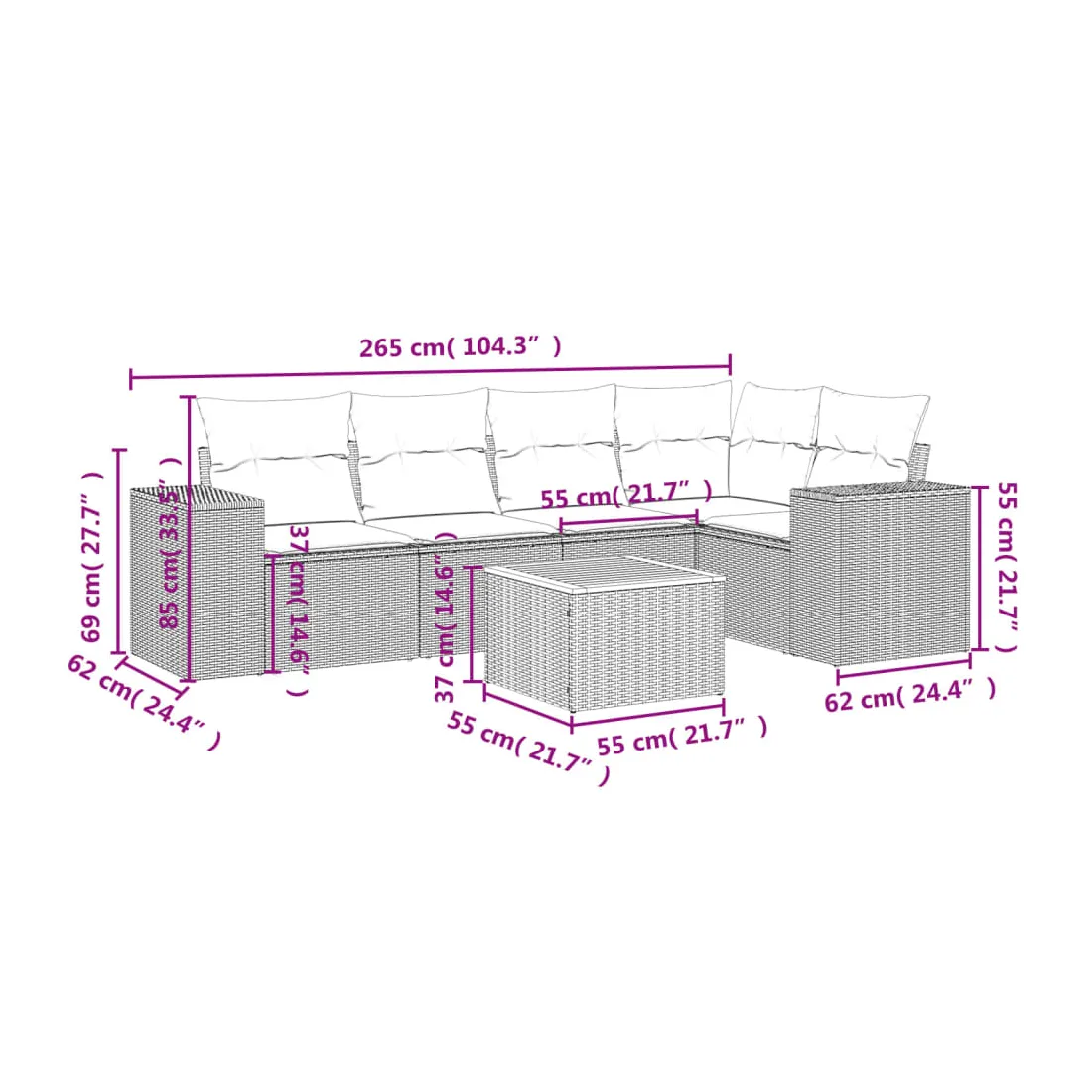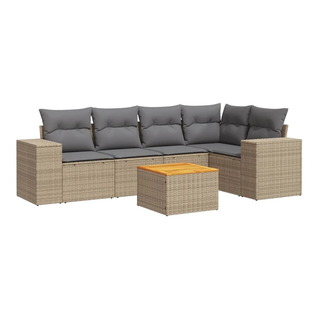 Cet ensemble de canapés de jardin est le complément parfait de votre arrière-cour, terrasse ou patio, offrant un espace confortable et accueillant pour discuter avec la famille et les amis ou simplement se détendre et profiter de l'extérieur. Matériau durable : la résine tressée, également connue sous le nom de poly rotin, est un matériau synthétique solide et nécessitant peu d'entretien qui ressemble au rotin naturel. Il est léger, facile à nettoyer et couramment utilisé pour les meubles d'extérieur en raison de sa durabilité et de ses propriétés de résistance aux intempéries.Dessus stable et facile à nettoyer : cette table de jardin a un dessus en bois d'acacia robuste, durable et facile à nettoyer avec un chiffon humide. Expérience d'assise confortable : ce mobilier d'extérieur, doté de coussins épais, offre une expérience d'assise confortable.Housse amovible et lavable : ces coussins de siège sont dotés de housses amovibles pour un lavage et un entretien faciles.Conception modulaire : cet ensemble de meubles d'extérieur a une conception modulaire, ce qui le rend complètement flexible et facile à déplacer, afin que vous puissiez créer un agencement de meubles d'extérieur personnalisé. Bon à savoir :Pour que vos meubles d'extérieur restent beaux, nous vous recommandons de les protéger avec une housse imperméable.