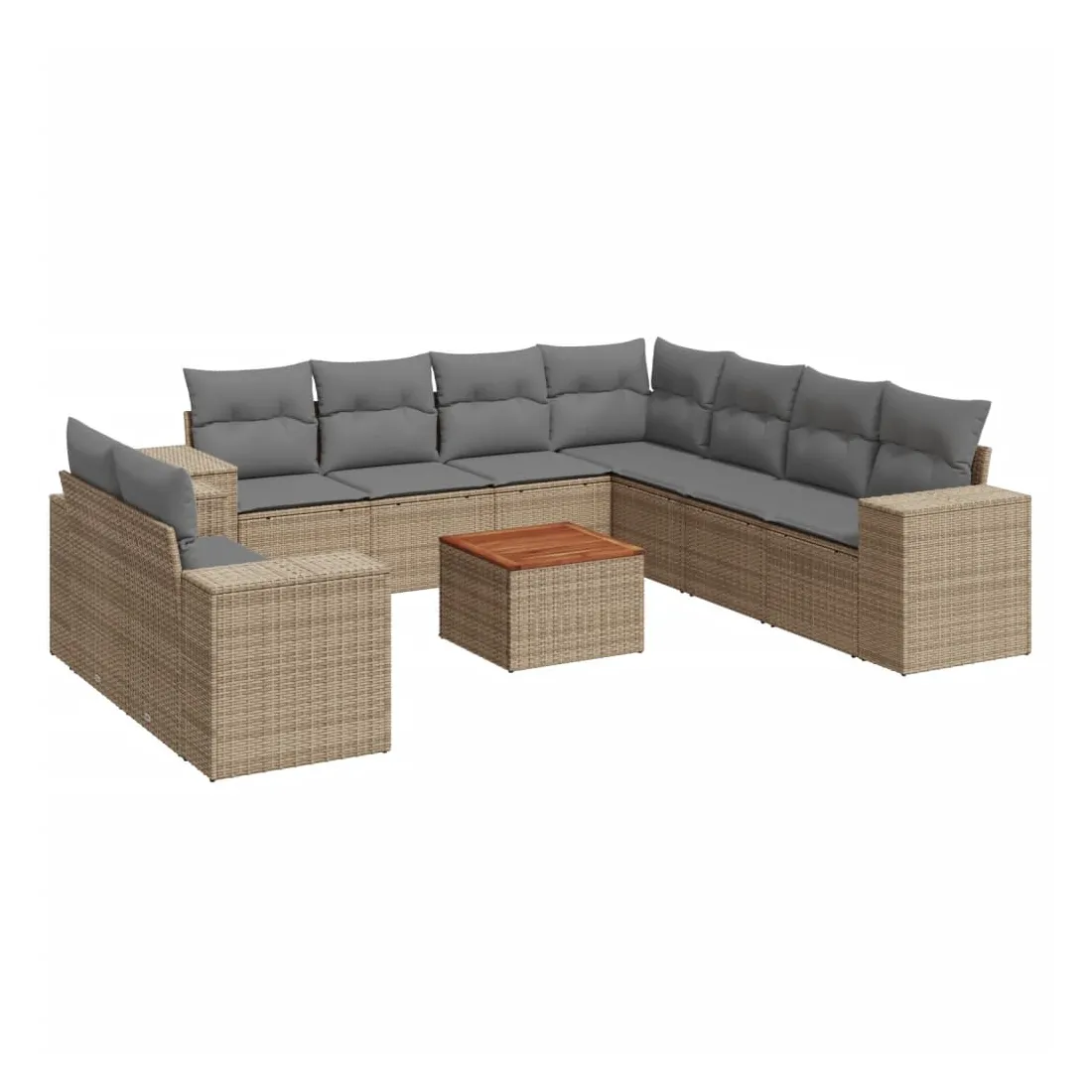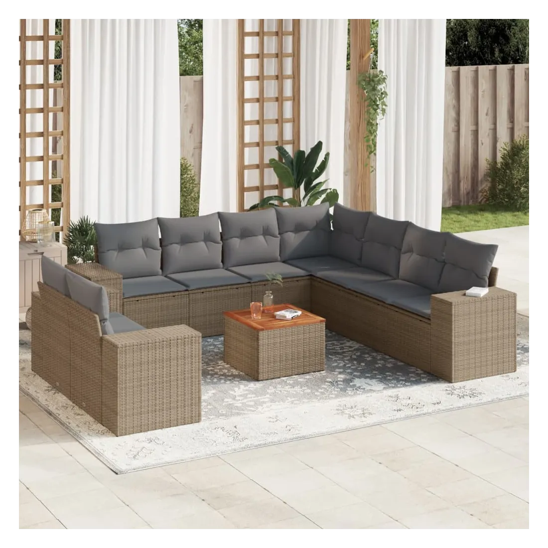 Cet ensemble de canapés de jardin est le complément parfait de votre arrière-cour, terrasse ou patio, offrant un espace confortable et accueillant pour discuter avec la famille et les amis ou simplement se détendre et profiter de l'extérieur. Matériau durable : la résine tressée, également connue sous le nom de poly rotin, est un matériau synthétique solide et nécessitant peu d'entretien qui ressemble au rotin naturel. Il est léger, facile à nettoyer et couramment utilisé pour les meubles d'extérieur en raison de sa durabilité et de ses propriétés de résistance aux intempéries.Dessus stable et facile à nettoyer : cette table de jardin a un dessus en bois d'acacia robuste, durable et facile à nettoyer avec un chiffon humide. Expérience d'assise confortable : ce mobilier d'extérieur, doté de coussins épais, offre une expérience d'assise confortable. Housse amovible et lavable : ces coussins de siège sont dotés de housses amovibles pour un lavage et un entretien faciles.Conception modulaire : cet ensemble de meubles d'extérieur a une conception modulaire, ce qui le rend complètement flexible et facile à déplacer, afin que vous puissiez créer un agencement de meubles d'extérieur personnalisé. Bon à savoir :Pour que vos meubles d'extérieur restent beaux, nous vous recommandons de les protéger avec une housse imperméable.