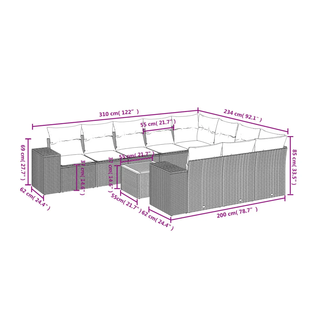 Cet ensemble de canapés de jardin est le complément parfait de votre arrière-cour, terrasse ou patio, offrant un espace confortable et accueillant pour discuter avec la famille et les amis ou simplement se détendre et profiter de l'extérieur. Matériau durable : la résine tressée, également connue sous le nom de poly rotin, est un matériau synthétique solide et nécessitant peu d'entretien qui ressemble au rotin naturel. Il est léger, facile à nettoyer et couramment utilisé pour les meubles d'extérieur en raison de sa durabilité et de ses propriétés de résistance aux intempéries.Dessus stable et facile à nettoyer : cette table de jardin a un dessus en bois d'acacia robuste, durable et facile à nettoyer avec un chiffon humide. Expérience d'assise confortable : ce mobilier d'extérieur, doté de coussins épais, offre une expérience d'assise confortable.Housse amovible et lavable : ces coussins de siège sont dotés de housses amovibles pour un lavage et un entretien faciles.Conception modulaire : cet ensemble de meubles d'extérieur a une conception modulaire, ce qui le rend complètement flexible et facile à déplacer, afin que vous puissiez créer un agencement de meubles d'extérieur personnalisé. Bon à savoir :Pour que vos meubles d'extérieur restent beaux, nous vous recommandons de les protéger avec une housse imperméable.