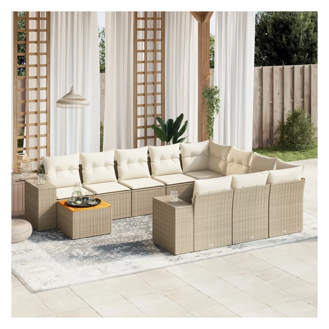 Cet ensemble de canapés de jardin est le complément parfait de votre arrière-cour, terrasse ou patio, offrant un espace confortable et accueillant pour discuter avec la famille et les amis ou simplement se détendre et profiter de l'extérieur. Matériau durable : la résine tressée, également connue sous le nom de poly rotin, est un matériau synthétique solide et nécessitant peu d'entretien qui ressemble au rotin naturel. Il est léger, facile à nettoyer et couramment utilisé pour les meubles d'extérieur en raison de sa durabilité et de ses propriétés de résistance aux intempéries.Dessus stable et facile à nettoyer : cette table de jardin a un dessus en bois d'acacia robuste, durable et facile à nettoyer avec un chiffon humide. Expérience d'assise confortable : ce mobilier d'extérieur, doté de coussins épais, offre une expérience d'assise confortable.Housse amovible et lavable : ces coussins de siège sont dotés de housses amovibles pour un lavage et un entretien faciles.Conception modulaire : cet ensemble de meubles d'extérieur a une conception modulaire, ce qui le rend complètement flexible et facile à déplacer, afin que vous puissiez créer un agencement de meubles d'extérieur personnalisé. Bon à savoir :Pour que vos meubles d'extérieur restent beaux, nous vous recommandons de les protéger avec une housse imperméable.
