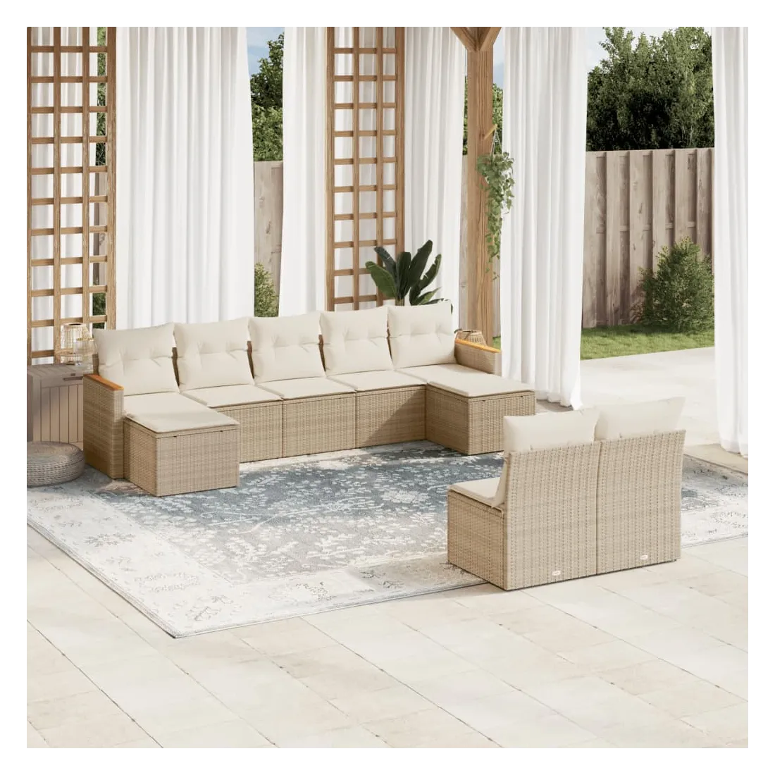 Cet ensemble de canapés de jardin est le complément parfait de votre arrière-cour, terrasse ou patio, offrant un espace confortable et accueillant pour discuter avec la famille et les amis ou simplement se détendre et profiter de l'extérieur. Matériau durable : la résine tressée, également connue sous le nom de poly rotin, est un matériau synthétique solide et nécessitant peu d'entretien qui ressemble au rotin naturel. Il est léger, facile à nettoyer et couramment utilisé pour les meubles d'extérieur en raison de sa durabilité et de ses propriétés de résistance aux intempéries.Housse amovible et lavable : ces coussins de siège sont dotés de housses amovibles pour un lavage et un entretien faciles.Cadre robuste et stable : le cadre en acier enduit de poudre assure la solidité et la stabilité du meuble de jardin pour une utilisation quotidienne à l'extérieur.Conception modulaire : cet ensemble de meubles d'extérieur a une conception modulaire, ce qui le rend complètement flexible et facile à déplacer, afin que vous puissiez créer un agencement de meubles d'extérieur personnalisé. Bon à savoir :Pour que vos meubles d'extérieur restent beaux, nous vous recommandons de les protéger avec une housse imperméable.
