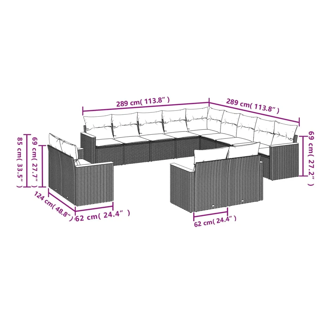 Cet ensemble de canapés de jardin est le complément parfait de votre arrière-cour, terrasse ou patio, offrant un espace confortable et accueillant pour discuter avec la famille et les amis ou simplement se détendre et profiter de l'extérieur. Matériau durable : la résine tressée, également connue sous le nom de poly rotin, est un matériau synthétique solide et nécessitant peu d'entretien qui ressemble au rotin naturel. Il est léger, facile à nettoyer et couramment utilisé pour les meubles d'extérieur en raison de sa durabilité et de ses propriétés de résistance aux intempéries.Housse amovible et lavable : ces coussins de siège sont dotés de housses amovibles pour un lavage et un entretien faciles.Cadre robuste et stable : le cadre en acier enduit de poudre assure la solidité et la stabilité du meuble de jardin pour une utilisation quotidienne à l'extérieur.Conception modulaire : cet ensemble de meubles d'extérieur a une conception modulaire, ce qui le rend complètement flexible et facile à déplacer, afin que vous puissiez créer un agencement de meubles d'extérieur personnalisé. Bon à savoir :Pour que vos meubles d'extérieur restent beaux, nous vous recommandons de les protéger avec une housse imperméable.