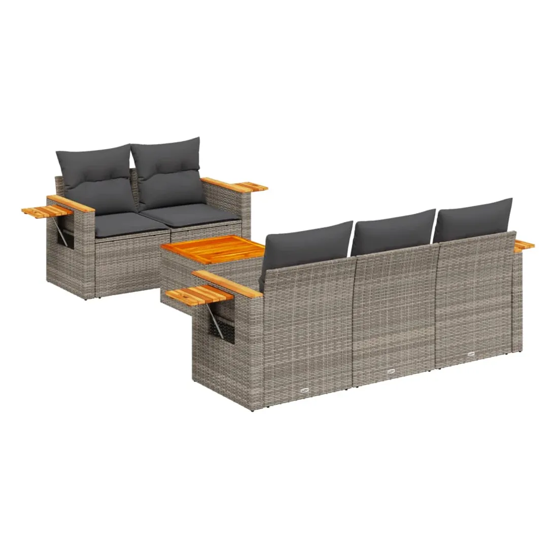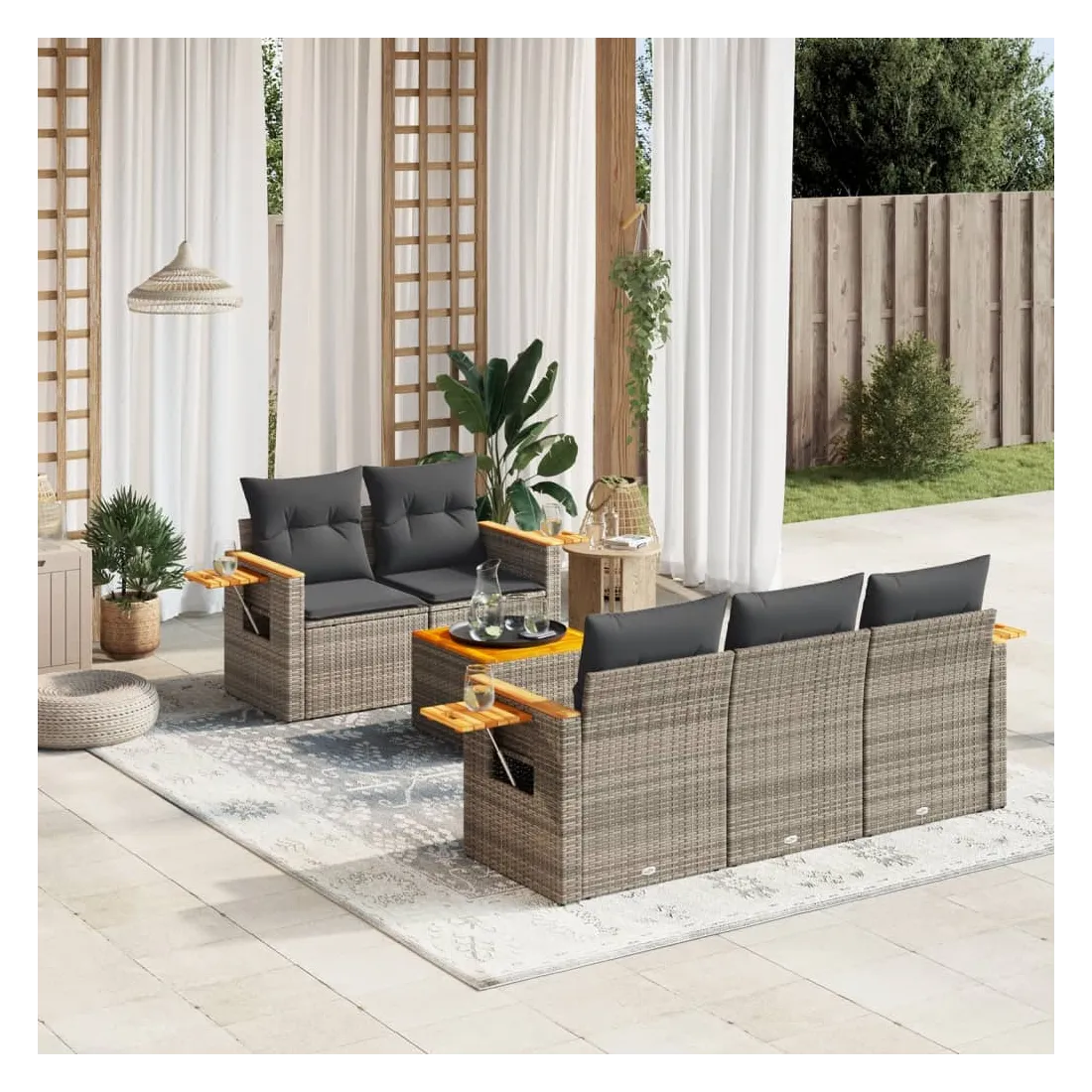Cet ensemble de canapés de jardin est le complément parfait de votre arrière-cour, terrasse ou patio, offrant un espace confortable et accueillant pour discuter avec la famille et les amis ou simplement se détendre et profiter de l'extérieur. Matériau durable : la résine tressée, également connue sous le nom de poly rotin, est un matériau synthétique solide et nécessitant peu d'entretien qui ressemble au rotin naturel. Il est léger, facile à nettoyer et couramment utilisé pour les meubles d'extérieur en raison de sa durabilité et de ses propriétés de résistance aux intempéries.Dessus stable et facile à nettoyer : cette table de jardin a un dessus en bois d'acacia robuste, durable et facile à nettoyer avec un chiffon humide.Table d'appoint pratique : ce mobilier d'extérieur comprend une table d'appoint pliable avec un ressort à gaz sur les accoudoirs, offrant un endroit pratique pour garder vos essentiels à portée de main.Housse amovible et lavable : ces coussins de siège sont dotés de housses amovibles pour un lavage et un entretien faciles.Conception modulaire : cet ensemble de meubles d'extérieur a une conception modulaire, ce qui le rend complètement flexible et facile à déplacer, afin que vous puissiez créer un agencement de meubles d'extérieur personnalisé. Bon à savoir :Pour que vos meubles d'extérieur restent beaux, nous vous recommandons de les protéger avec une housse imperméable.