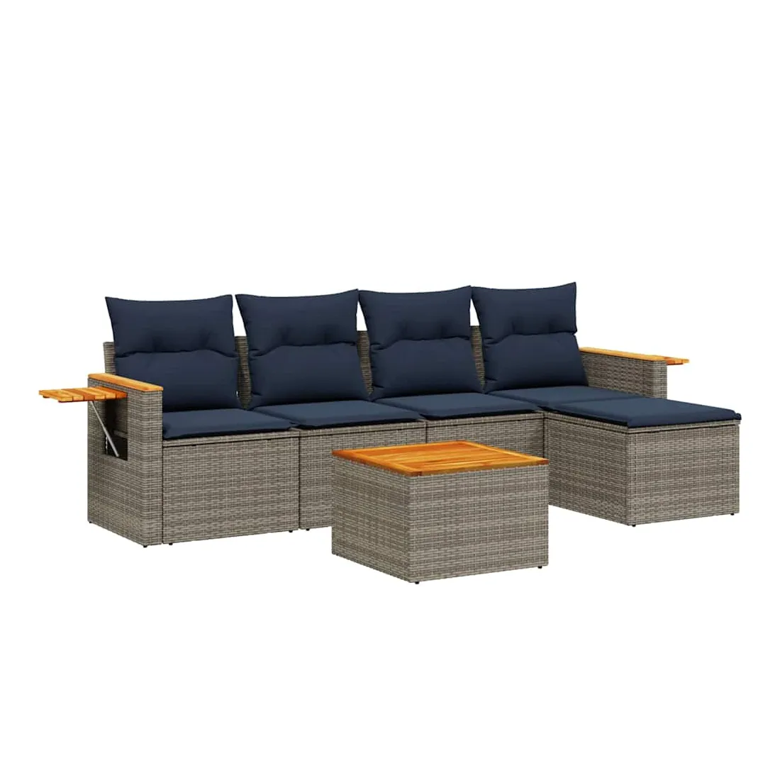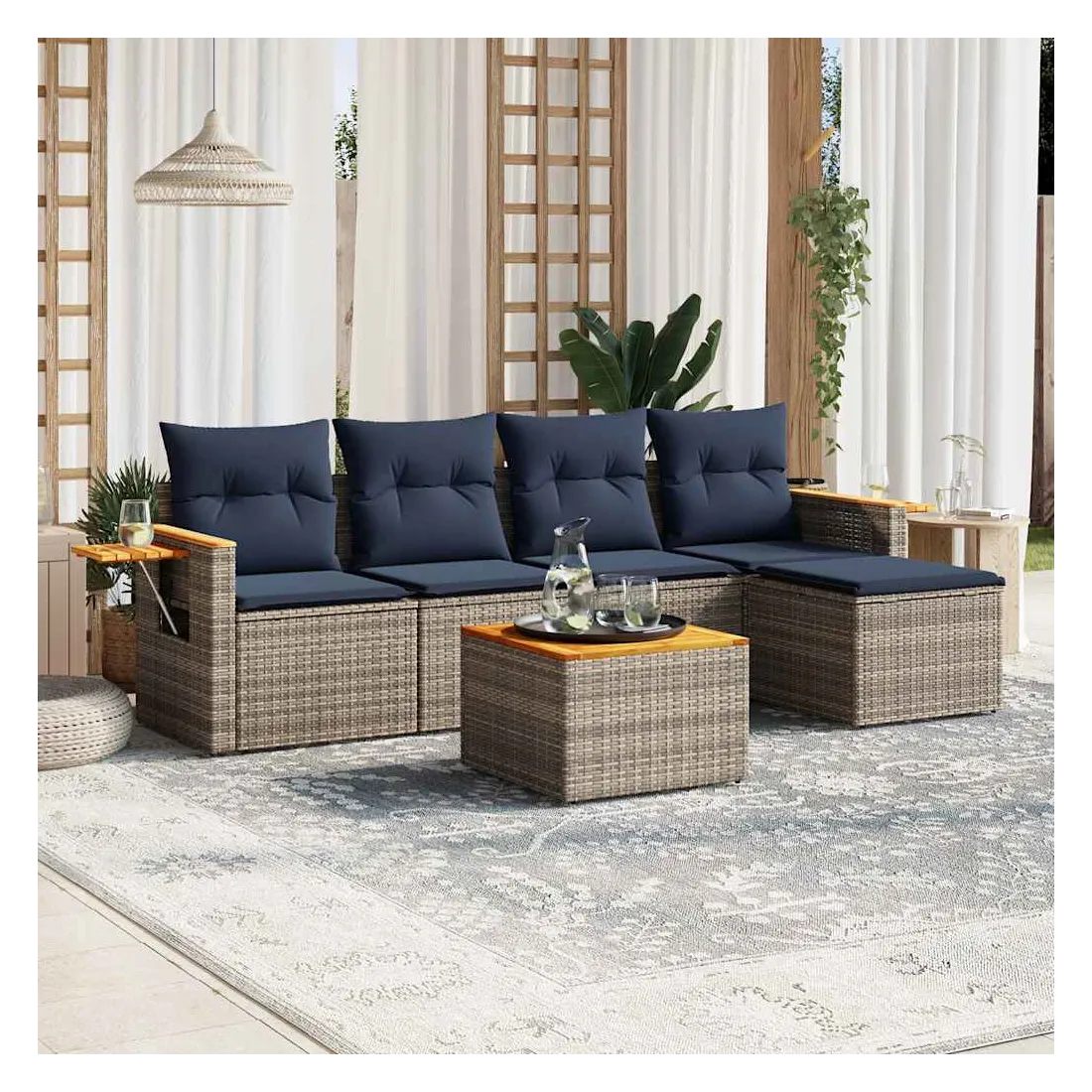 Cet ensemble de canapés de jardin est le complément parfait de votre arrière-cour, terrasse ou patio, offrant un espace confortable et accueillant pour discuter avec la famille et les amis ou simplement se détendre et profiter de l'extérieur. Matériau durable : la résine tressée, également connue sous le nom de poly rotin, est un matériau synthétique solide et nécessitant peu d'entretien qui ressemble au rotin naturel. Il est léger, facile à nettoyer et couramment utilisé pour les meubles d'extérieur en raison de sa durabilité et de ses propriétés de résistance aux intempéries.Dessus stable et facile à nettoyer : cette table de jardin a un dessus en bois d'acacia robuste, durable et facile à nettoyer avec un chiffon humide.Table d'appoint pratique : ce mobilier d'extérieur comprend une table d'appoint pliable avec un ressort à gaz sur les accoudoirs, offrant un endroit pratique pour garder vos essentiels à portée de main.Housse amovible et lavable : ces coussins de siège sont dotés de housses amovibles pour un lavage et un entretien faciles.Conception modulaire : cet ensemble de meubles d'extérieur a une conception modulaire, ce qui le rend complètement flexible et facile à déplacer, afin que vous puissiez créer un agencement de meubles d'extérieur personnalisé. Bon à savoir :Pour que vos meubles d'extérieur restent beaux, nous vous recommandons de les protéger avec une housse imperméable.