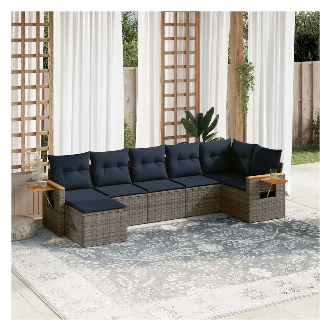 Cet ensemble de canapés de jardin est le complément parfait de votre arrière-cour, terrasse ou patio, offrant un espace confortable et accueillant pour discuter avec la famille et les amis ou simplement se détendre et profiter de l'extérieur. Matériau durable : la résine tressée, également connue sous le nom de poly rotin, est un matériau synthétique solide et nécessitant peu d'entretien qui ressemble au rotin naturel. Il est léger, facile à nettoyer et couramment utilisé pour les meubles d'extérieur en raison de sa durabilité et de ses propriétés de résistance aux intempéries.Table d'appoint pratique : ce mobilier d'extérieur comprend une table d'appoint pliable avec un ressort à gaz sur les accoudoirs, offrant un endroit pratique pour garder vos essentiels à portée de main.Housse amovible et lavable : ces coussins de siège sont dotés de housses amovibles pour un lavage et un entretien faciles.Conception modulaire : cet ensemble de meubles d'extérieur a une conception modulaire, ce qui le rend complètement flexible et facile à déplacer, afin que vous puissiez créer un agencement de meubles d'extérieur personnalisé. Bon à savoir :Pour que vos meubles d'extérieur restent beaux, nous vous recommandons de les protéger avec une housse imperméable.