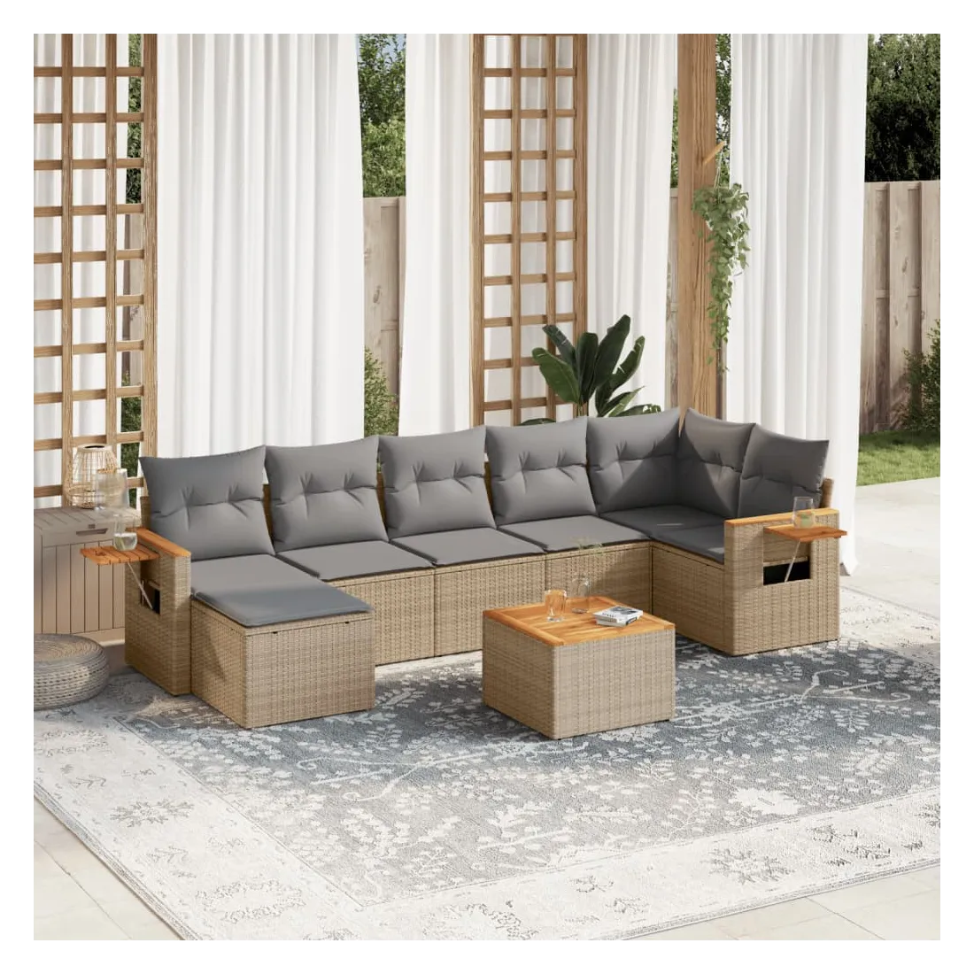 Cet ensemble de canapés de jardin est le complément parfait de votre arrière-cour, terrasse ou patio, offrant un espace confortable et accueillant pour discuter avec la famille et les amis ou simplement se détendre et profiter de l'extérieur. Matériau durable : la résine tressée, également connue sous le nom de poly rotin, est un matériau synthétique solide et nécessitant peu d'entretien qui ressemble au rotin naturel. Il est léger, facile à nettoyer et couramment utilisé pour les meubles d'extérieur en raison de sa durabilité et de ses propriétés de résistance aux intempéries.Dessus stable et facile à nettoyer : cette table de jardin a un dessus en bois d'acacia robuste, durable et facile à nettoyer avec un chiffon humide.Table d'appoint pratique : ce mobilier d'extérieur comprend une table d'appoint pliable avec un ressort à gaz sur les accoudoirs, offrant un endroit pratique pour garder vos essentiels à portée de main.Housse amovible et lavable : ces coussins de siège sont dotés de housses amovibles pour un lavage et un entretien faciles.Conception modulaire : cet ensemble de meubles d'extérieur a une conception modulaire, ce qui le rend complètement flexible et facile à déplacer, afin que vous puissiez créer un agencement de meubles d'extérieur personnalisé. Bon à savoir :Pour que vos meubles d'extérieur restent beaux, nous vous recommandons de les protéger avec une housse imperméable.