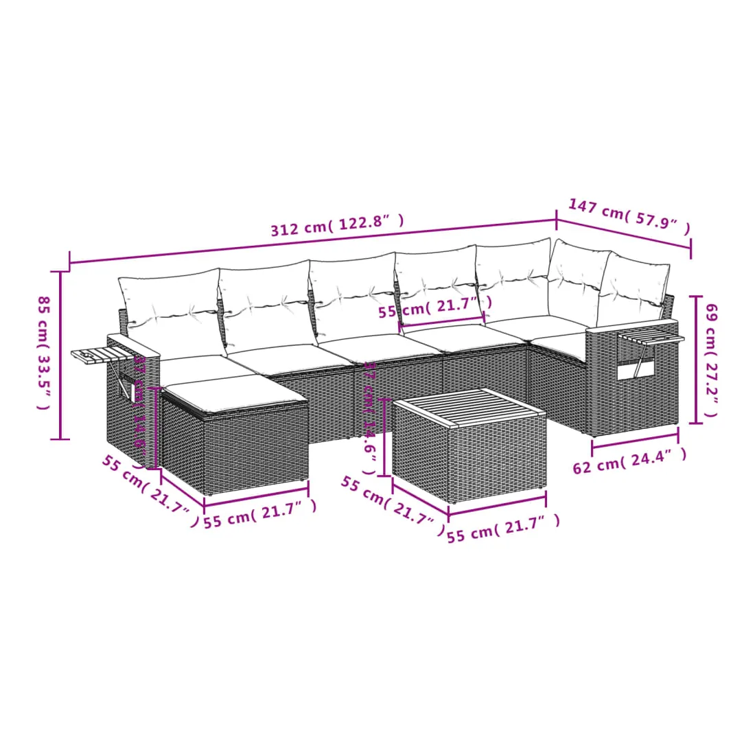 - 7 x coussin de siège avec housse amovible et lavable