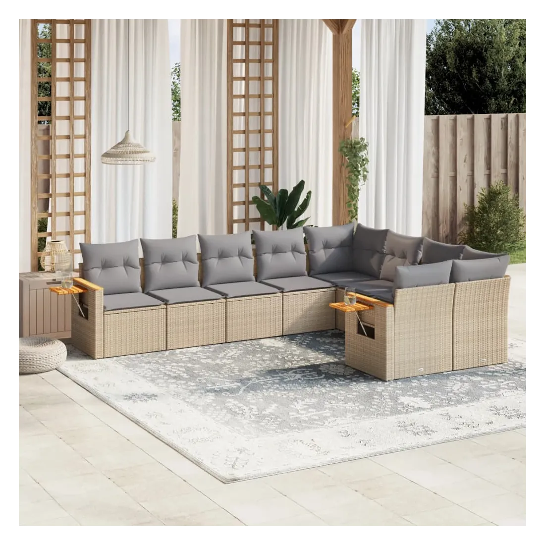 Cet ensemble de canapés de jardin est le complément parfait de votre arrière-cour, terrasse ou patio, offrant un espace confortable et accueillant pour discuter avec la famille et les amis ou simplement se détendre et profiter de l'extérieur. Matériau durable : la résine tressée, également connue sous le nom de poly rotin, est un matériau synthétique solide et nécessitant peu d'entretien qui ressemble au rotin naturel. Il est léger, facile à nettoyer et couramment utilisé pour les meubles d'extérieur en raison de sa durabilité et de ses propriétés de résistance aux intempéries.Table d'appoint pratique : ce mobilier d'extérieur comprend une table d'appoint pliable avec un ressort à gaz sur les accoudoirs, offrant un endroit pratique pour garder vos essentiels à portée de main.Housse amovible et lavable : ces coussins de siège sont dotés de housses amovibles pour un lavage et un entretien faciles.Conception modulaire : cet ensemble de meubles d'extérieur a une conception modulaire, ce qui le rend complètement flexible et facile à déplacer, afin que vous puissiez créer un agencement de meubles d'extérieur personnalisé. Bon à savoir :Pour que vos meubles d'extérieur restent beaux, nous vous recommandons de les protéger avec une housse imperméable.
